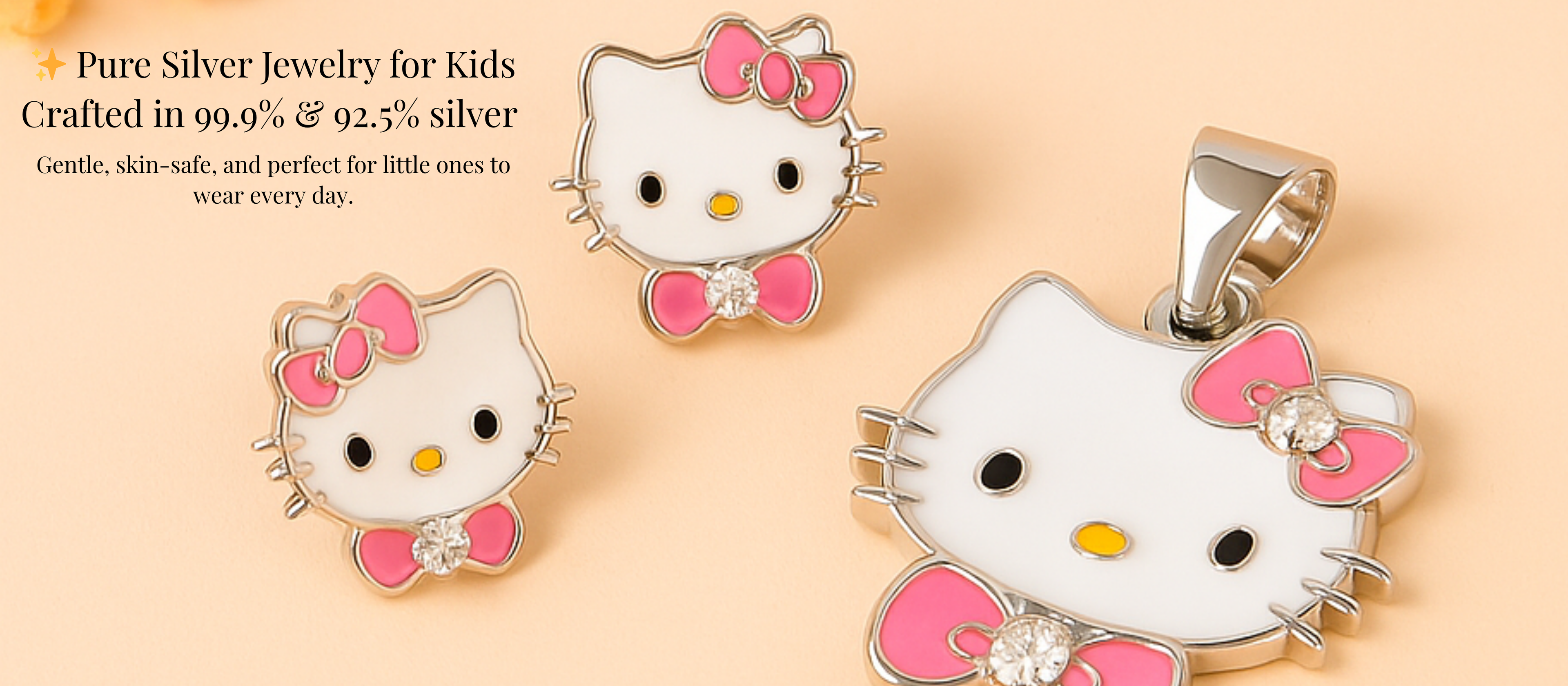 Bow-Kitty Sterling-Silver Pendant & Stud Set | White Enamel Face with Pink Bow-Tie