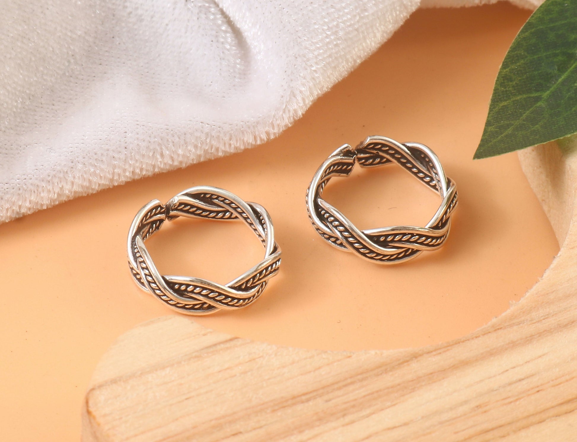 Add a touch of bold elegance to your look with these 925 sterling silver toe rings, featuring a unique braided knot design. The oxidized detailing enhances the texture of the twisted bands, making them stand out as a striking accessory.