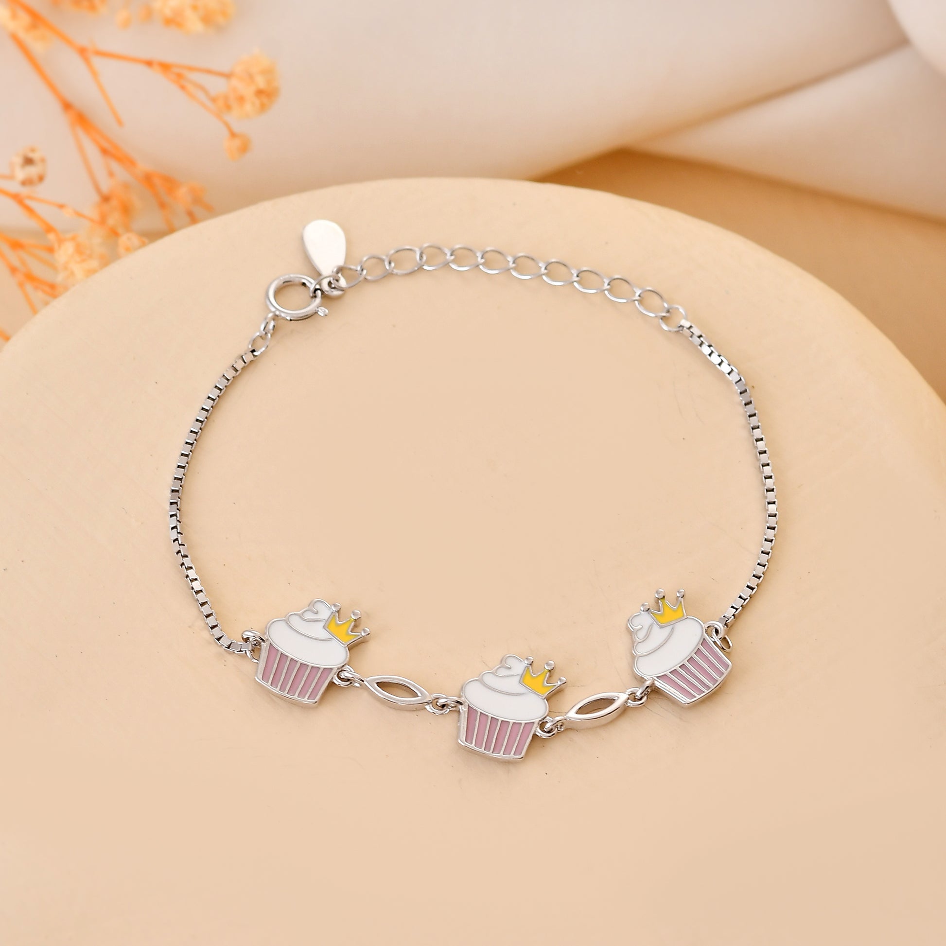 925 Sterling Silver Cupcake-Crown Charm Bracelet – Adjustable Kids Chain
