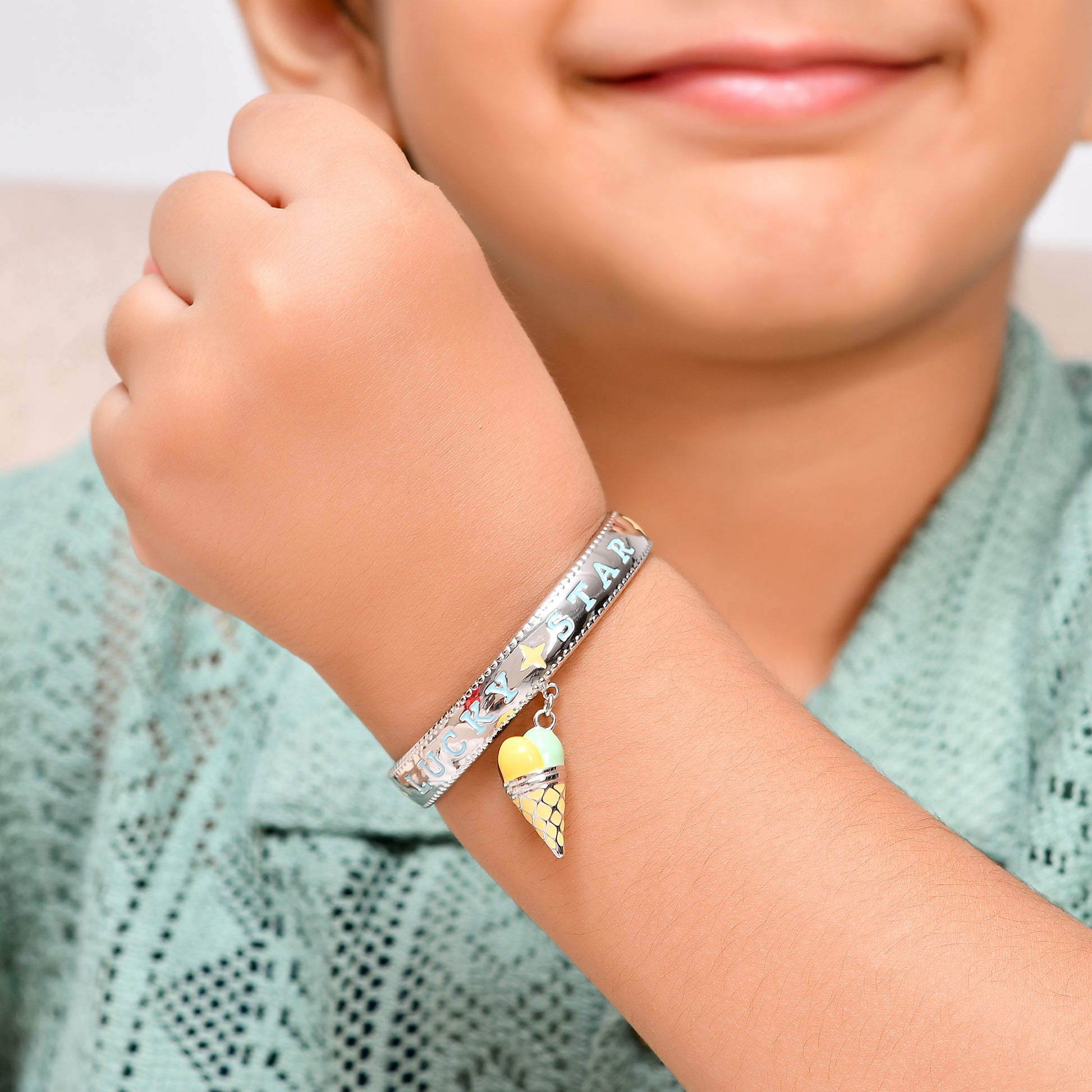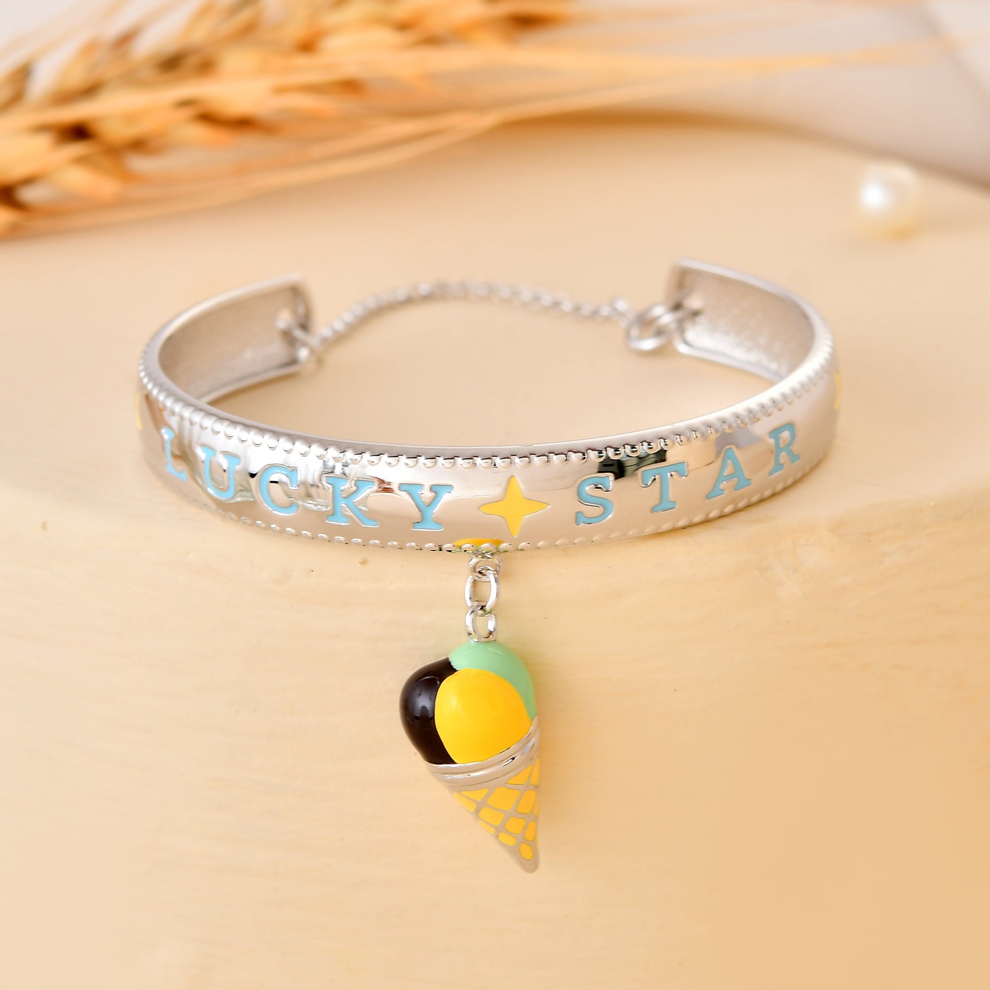 925 Sterling Silver “Lucky Star” Bangle with Dangling Ice-Cream Cone Charm – Adjustable Kids Bracelet