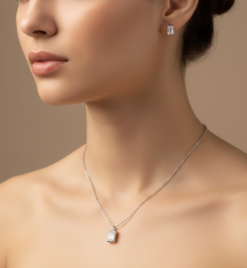 The necklace features a single baguette-cut cubic zirconia set in sleek silver, paired with matching CZ studs for a coordinated and timeless look. Handcrafted in solid sterling silver and finished with a rhodium polish, this set offers brilliance and durability.