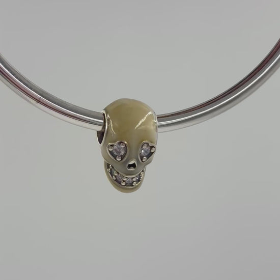 925 Sterling Silver Skull Bead Charm with Heart Eyes & Crystal Smile – Ivory Enamel Finish