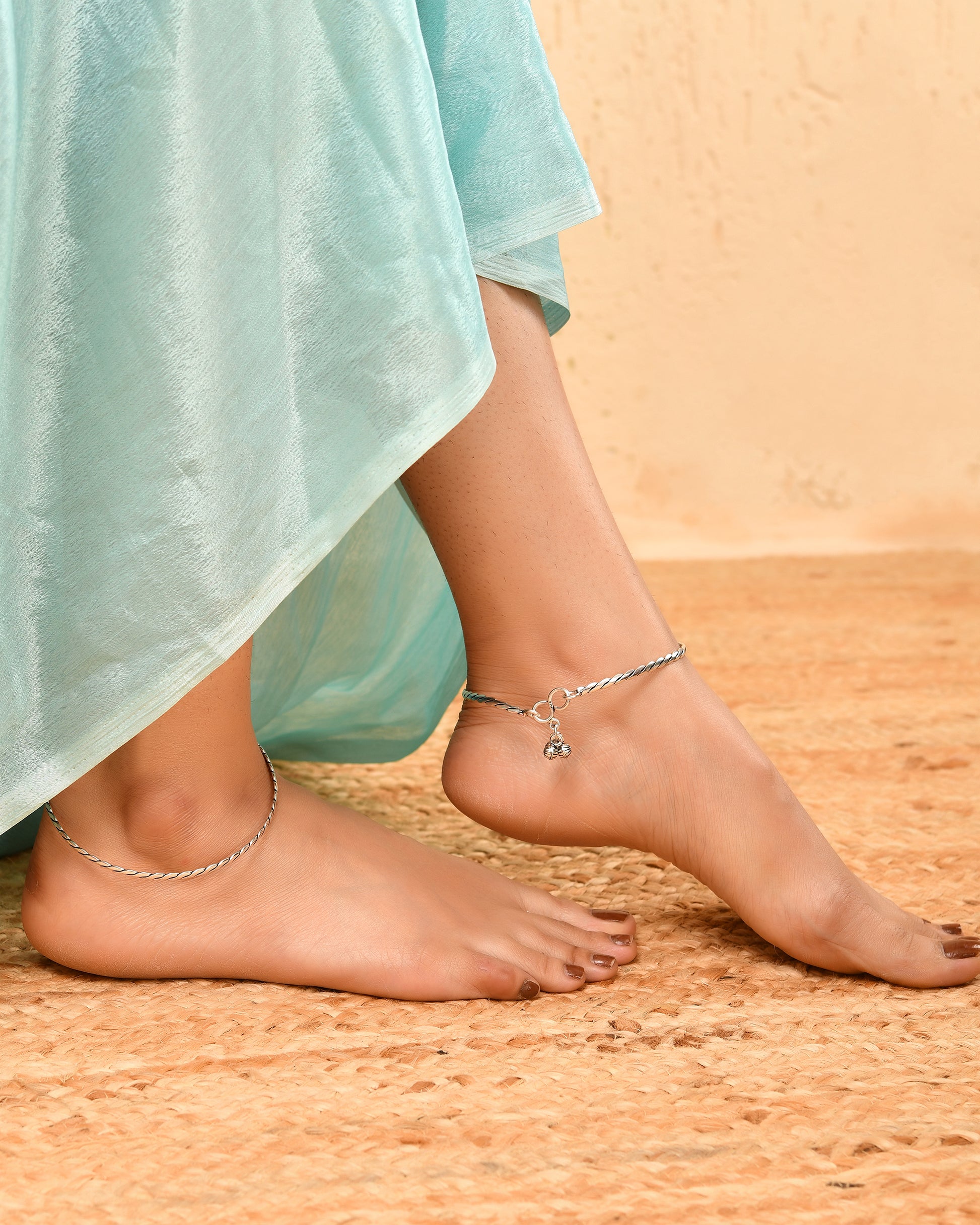 925 Sterling Silver Twisted Braid Anklet Pair with Charm Drops – Oxidized Payal