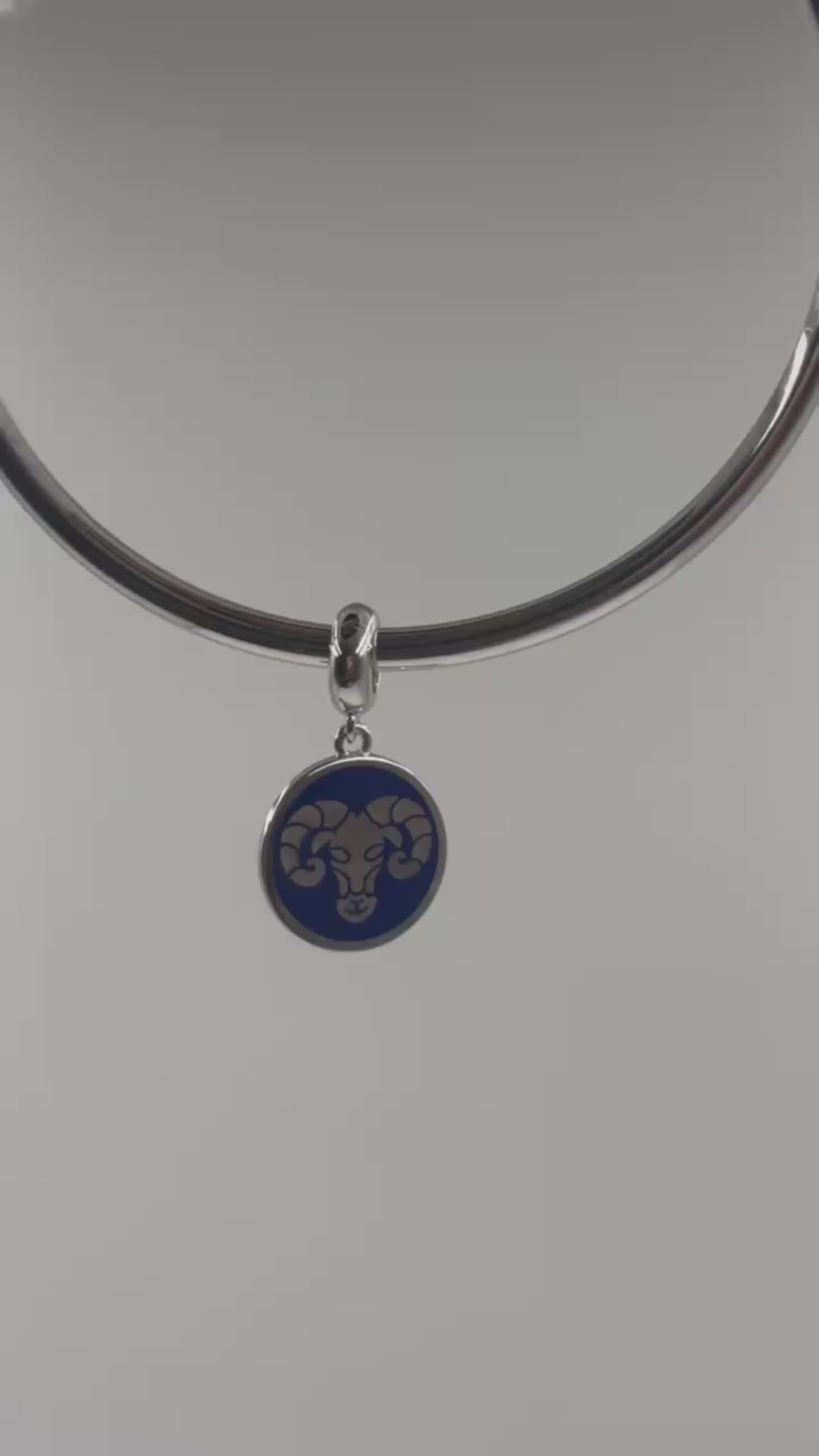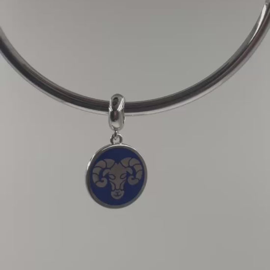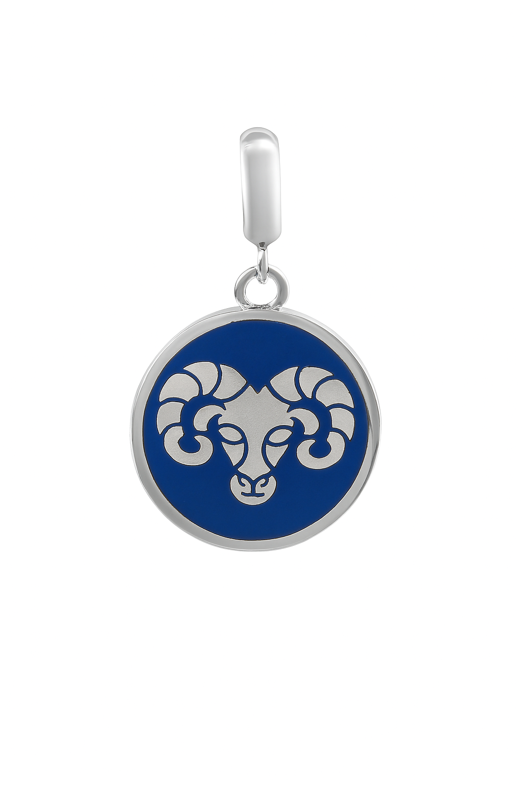 Expertly crafted in 925 sterling silver, the charm features a fierce ram’s head — the symbol of Aries — etched on a rich blue enamel background.