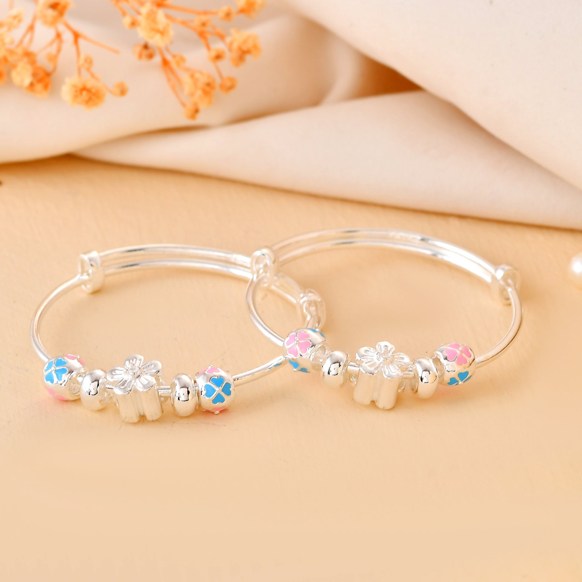 Blossom-Mosaic Sterling-Silver Baby Bangle Set | Adjustable Kada with Pink-Blue Enamel Beads