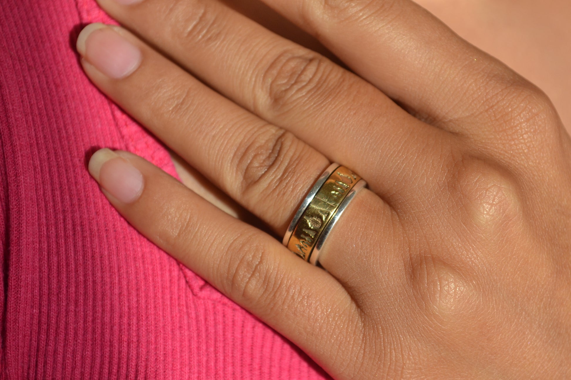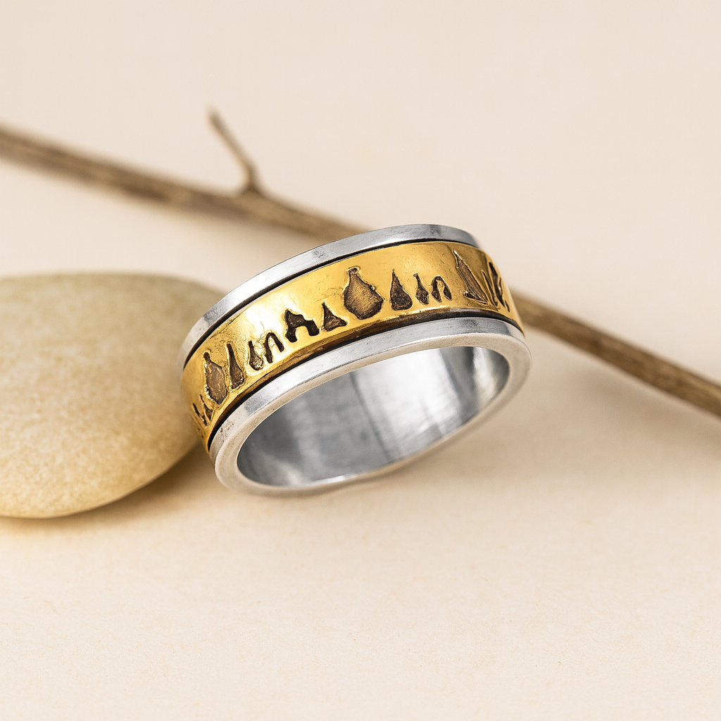 Elevate your style and calm your mind with this striking dual-tone spinner ring. Crafted in solid 925 sterling silver, this band features a central spinning band plated in gold with intricate engraved patterns, offering both visual appeal and meditative movement. Ideal for those who love fidget jewelry or simply seek a bold statement piece, this unisex design suits both men and women. Whether worn for daily mindfulness or as a standout accessory, this ring blends tradition with contemporary edge.