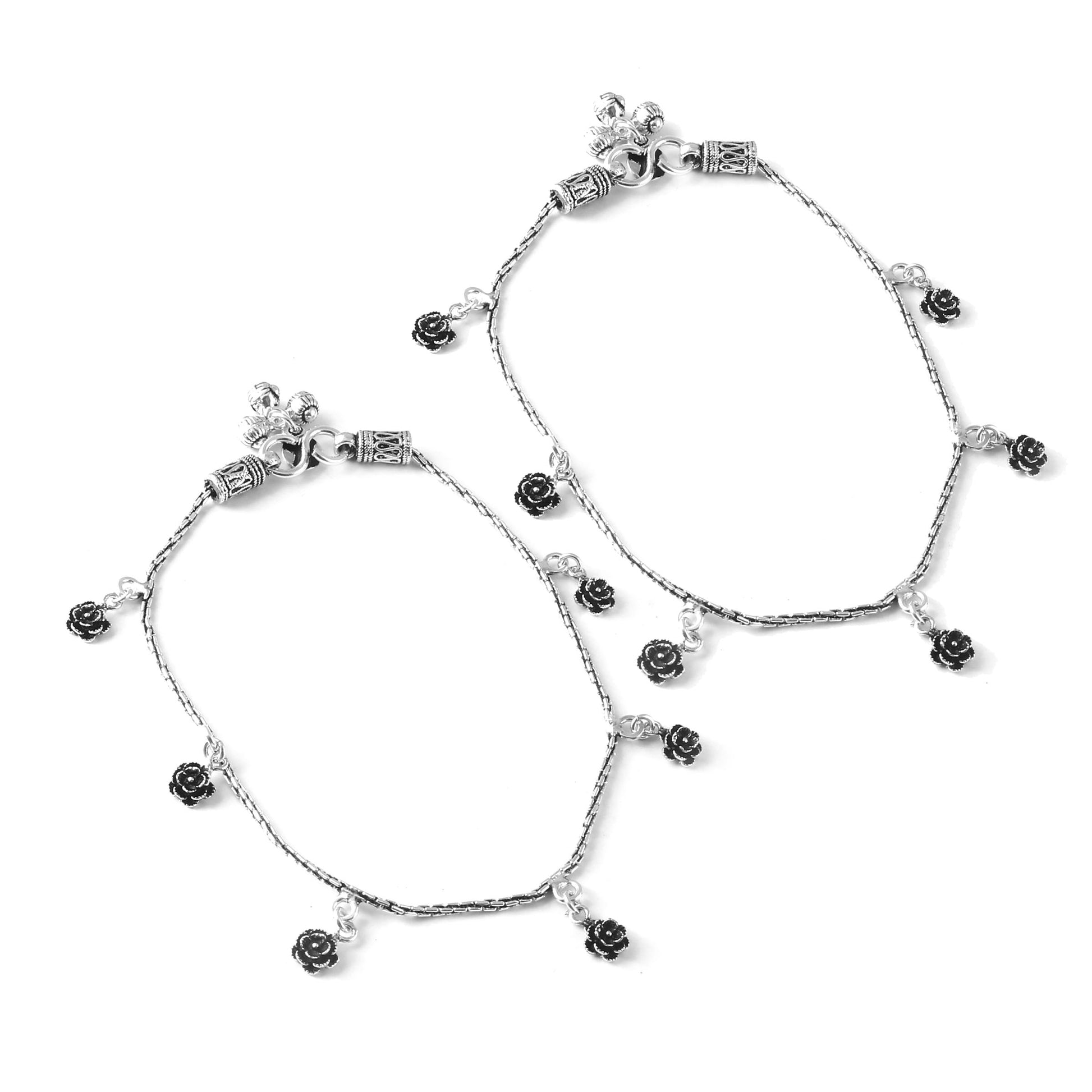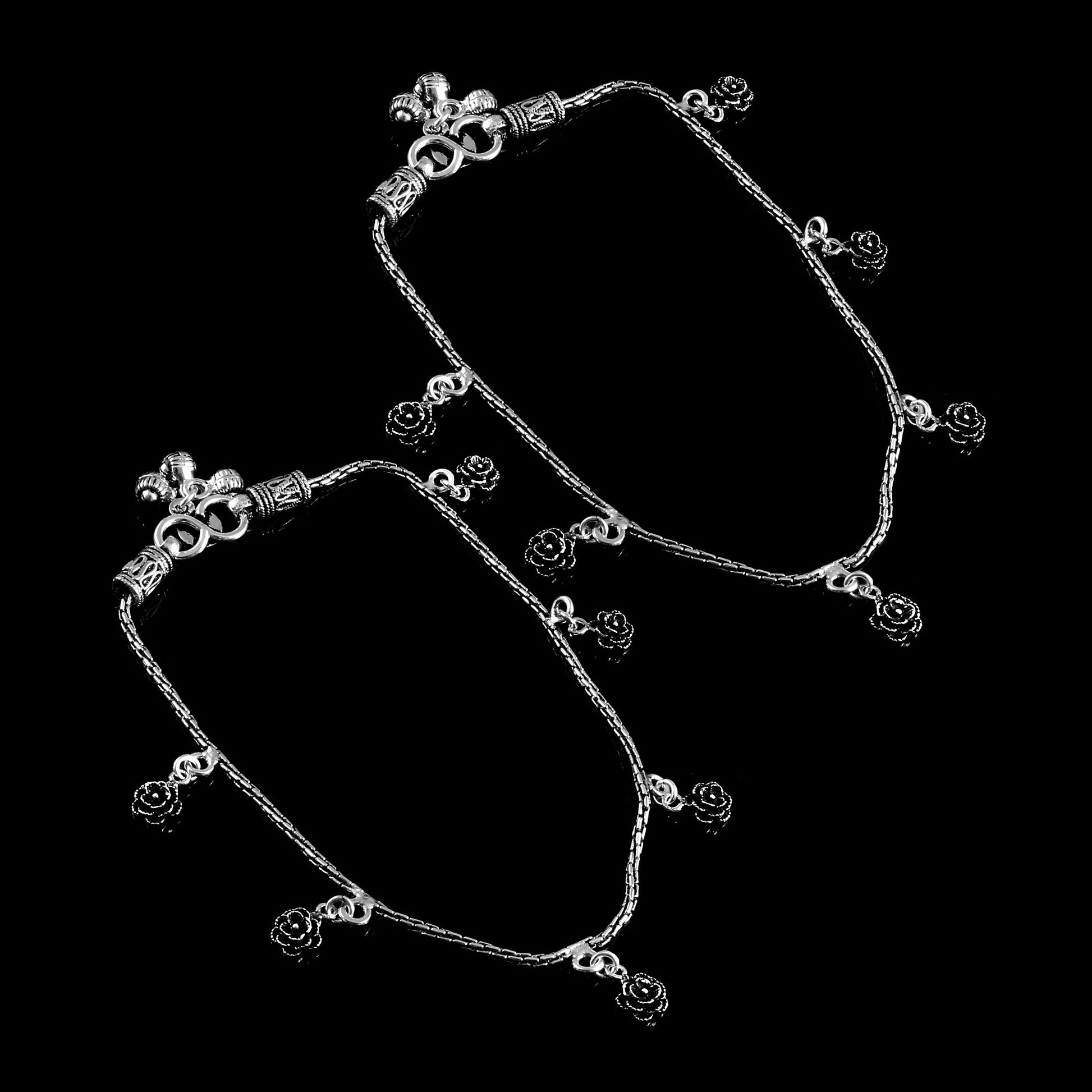 Bold yet elegant, the Gulnaar Anklet carries the essence of blooming roses in oxidised silver. It’s perfect for statement pairings and timeless grace.