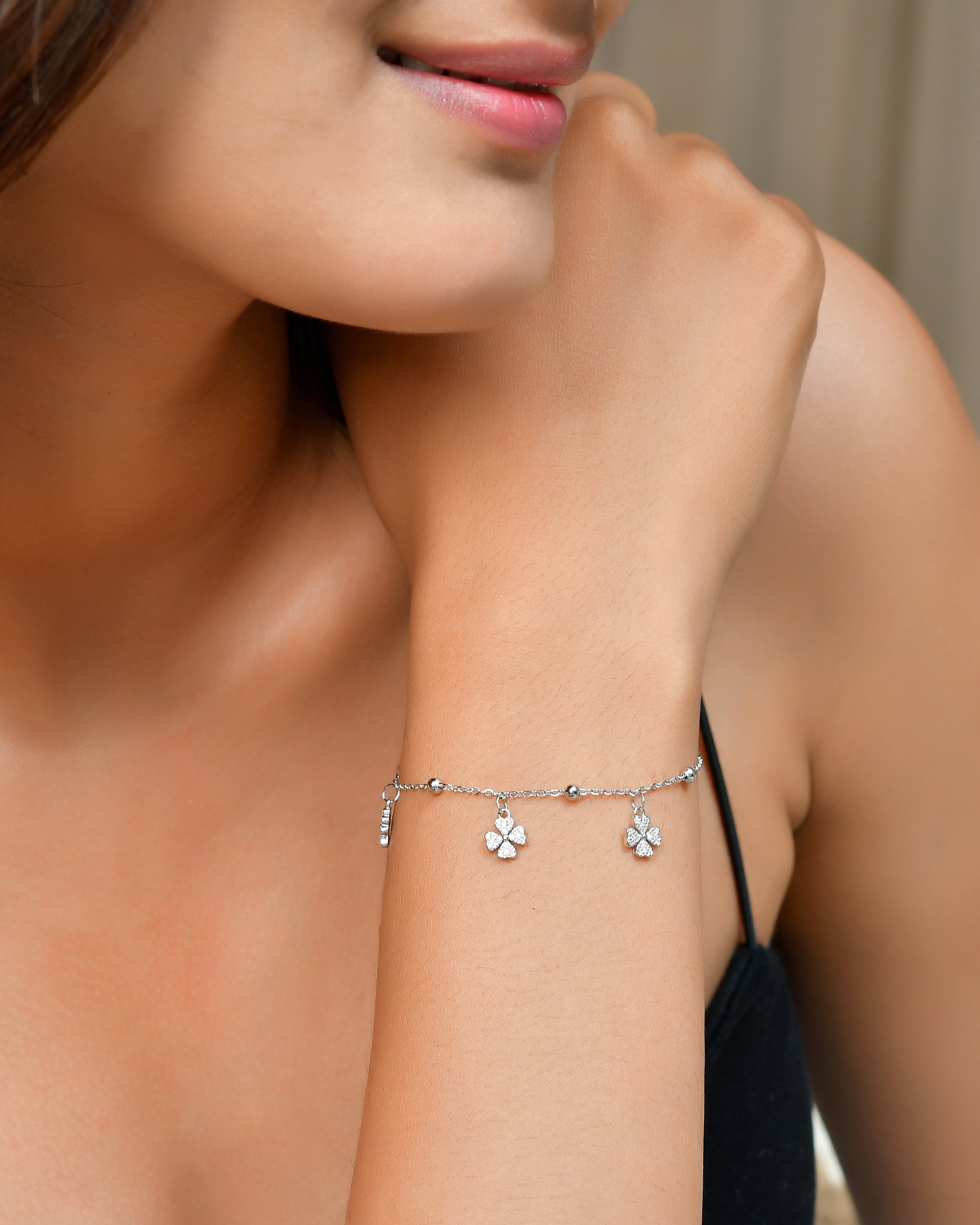 Hand-crafted from hypoallergenic 925 sterling silver, this dainty bracelet lets three micro-pavé four-leaf clovers dance freely between polished bead stations, catching light with every flick of the wrist.