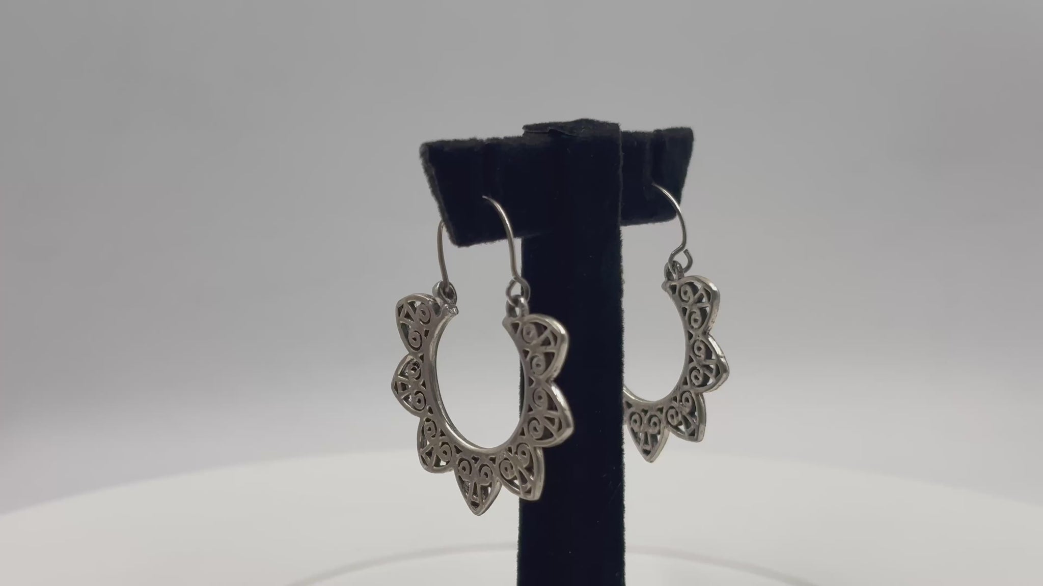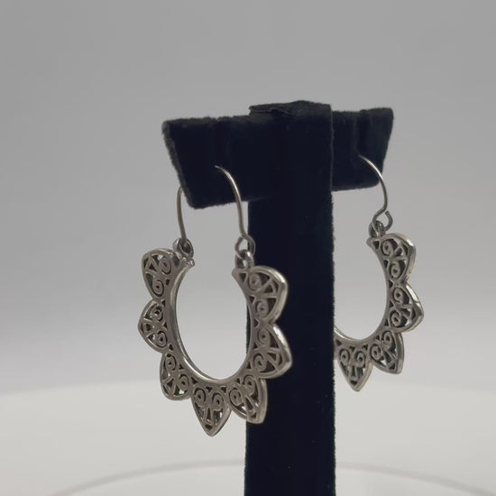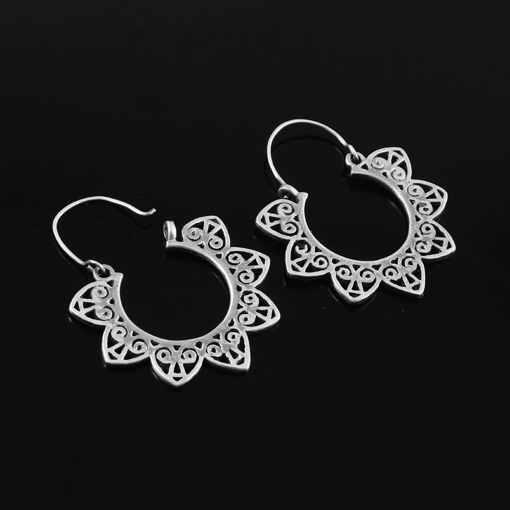 Each 925 silver hoop unfolds into an intricate petal formation, creating a sophisticated circular mandala that frames the face with architectural elegance.