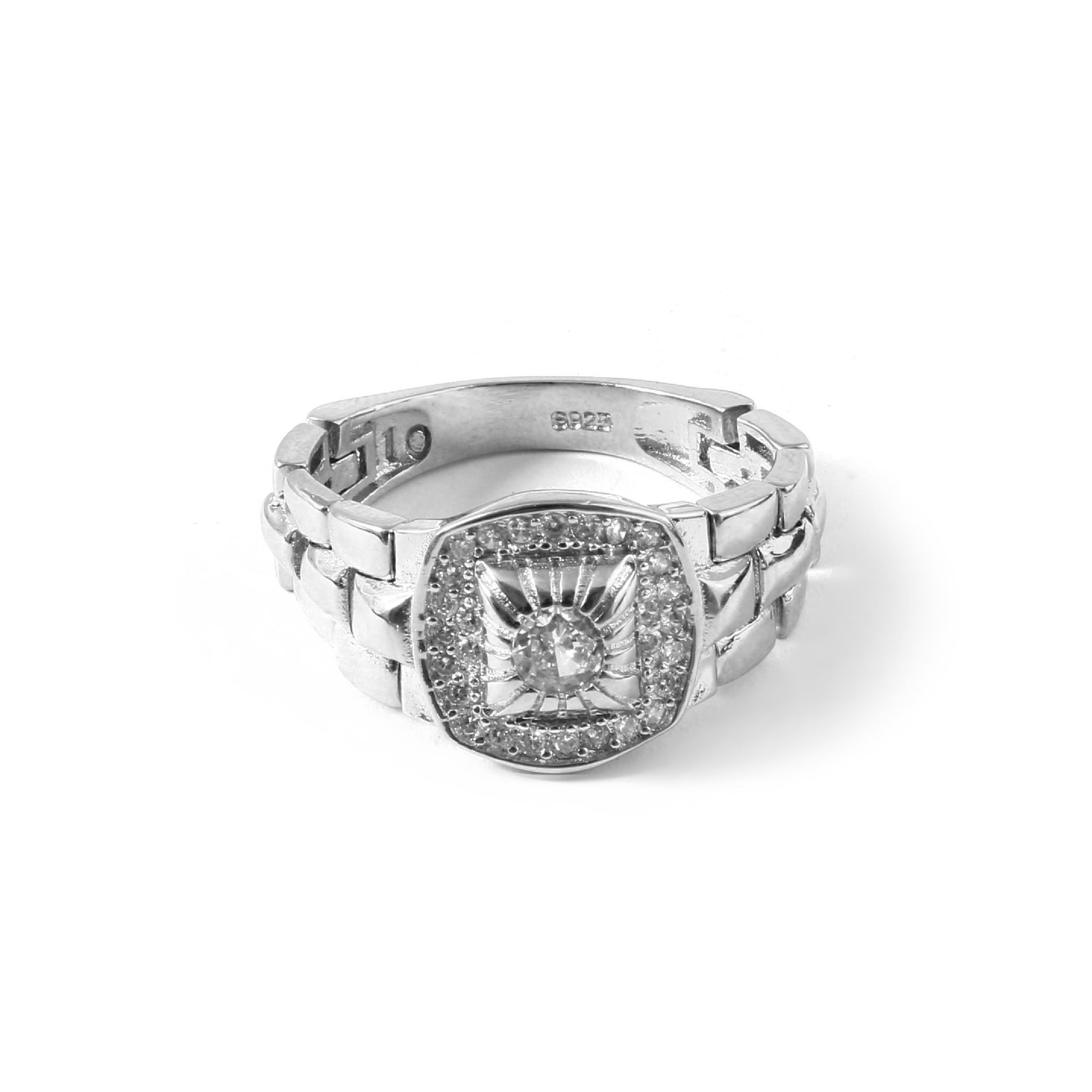 Make a strong style statement with this men’s 925 silver ring featuring a prominent cushion-cut zircon center framed by micro-studded zirconia accents.