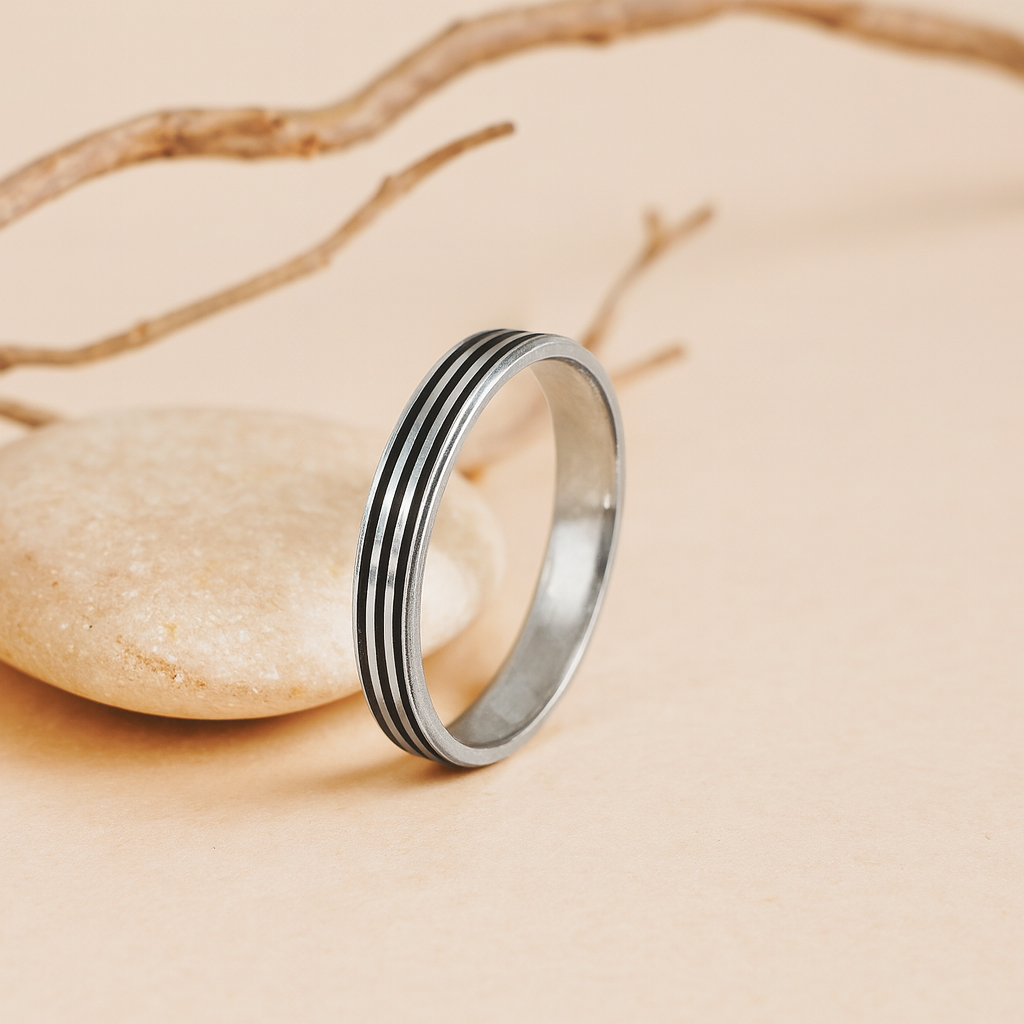 Handcrafted from high-quality 925 sterling silver, this band showcases three sleek parallel grooves that run across its circumference, adding a modern and minimal aesthetic.