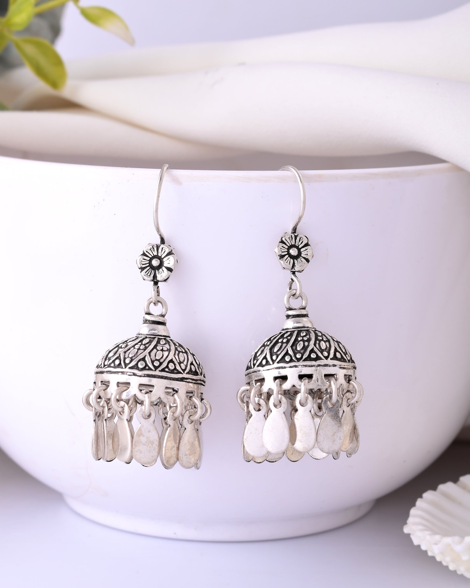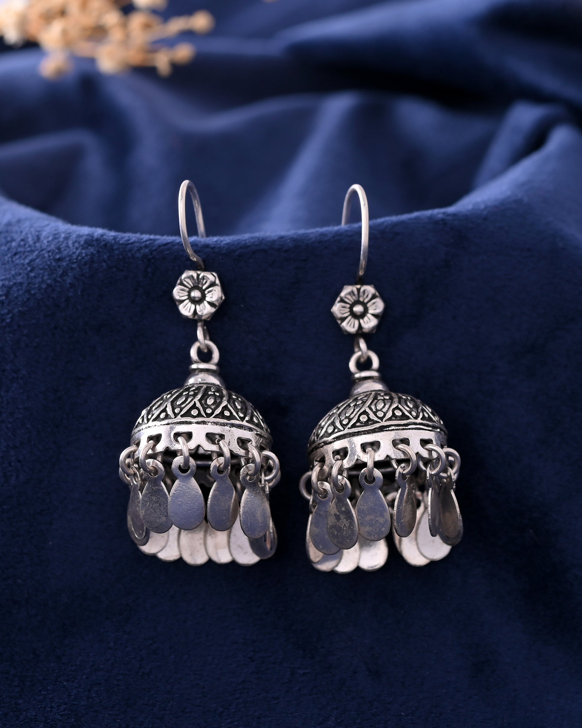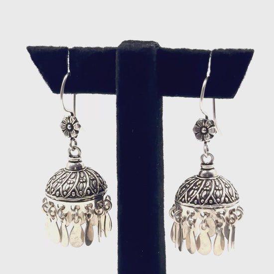 Naaz Jhumkas – Floral Top 925 Silver Dome Earrings with Dangling Petals