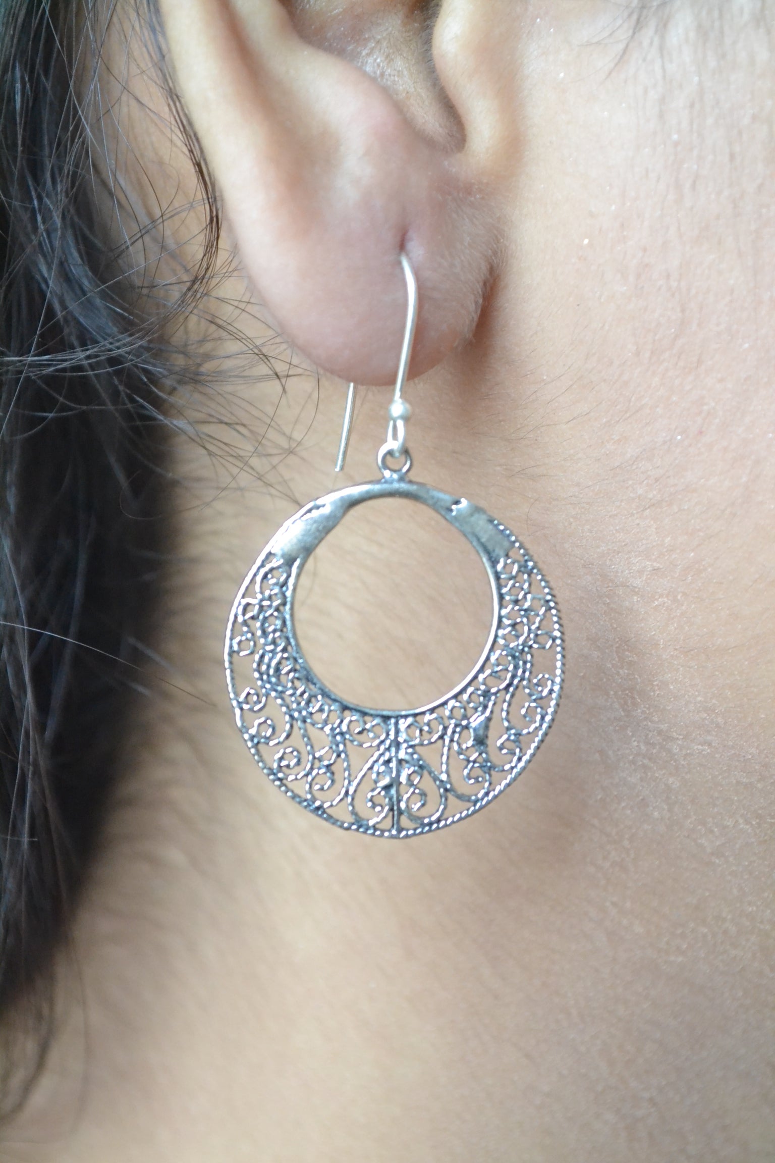 Nayra Earrings – Oxidised 925 Silver Filigree Hoop Dangle Earrings