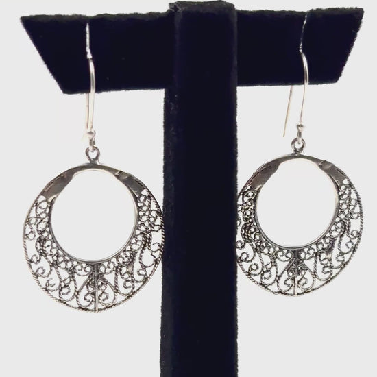 These earrings feature a fine filigree design in a rounded crescent form that softly sways with every movement.