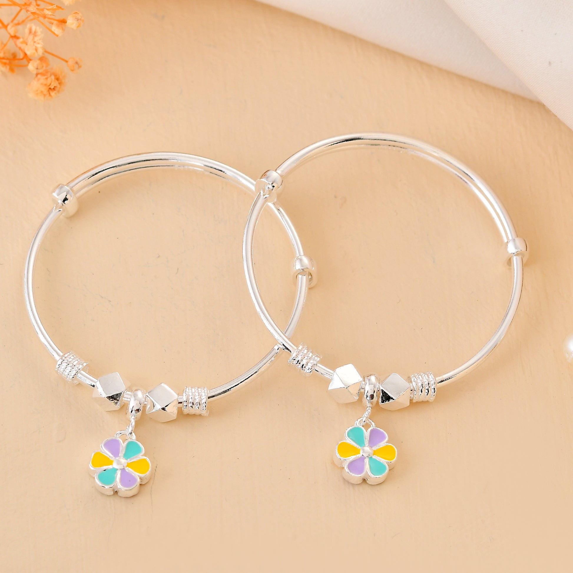 Pastel-Bloom Sterling-Silver Baby Bangle Set | Adjustable Kada with Enamel Flower Charm