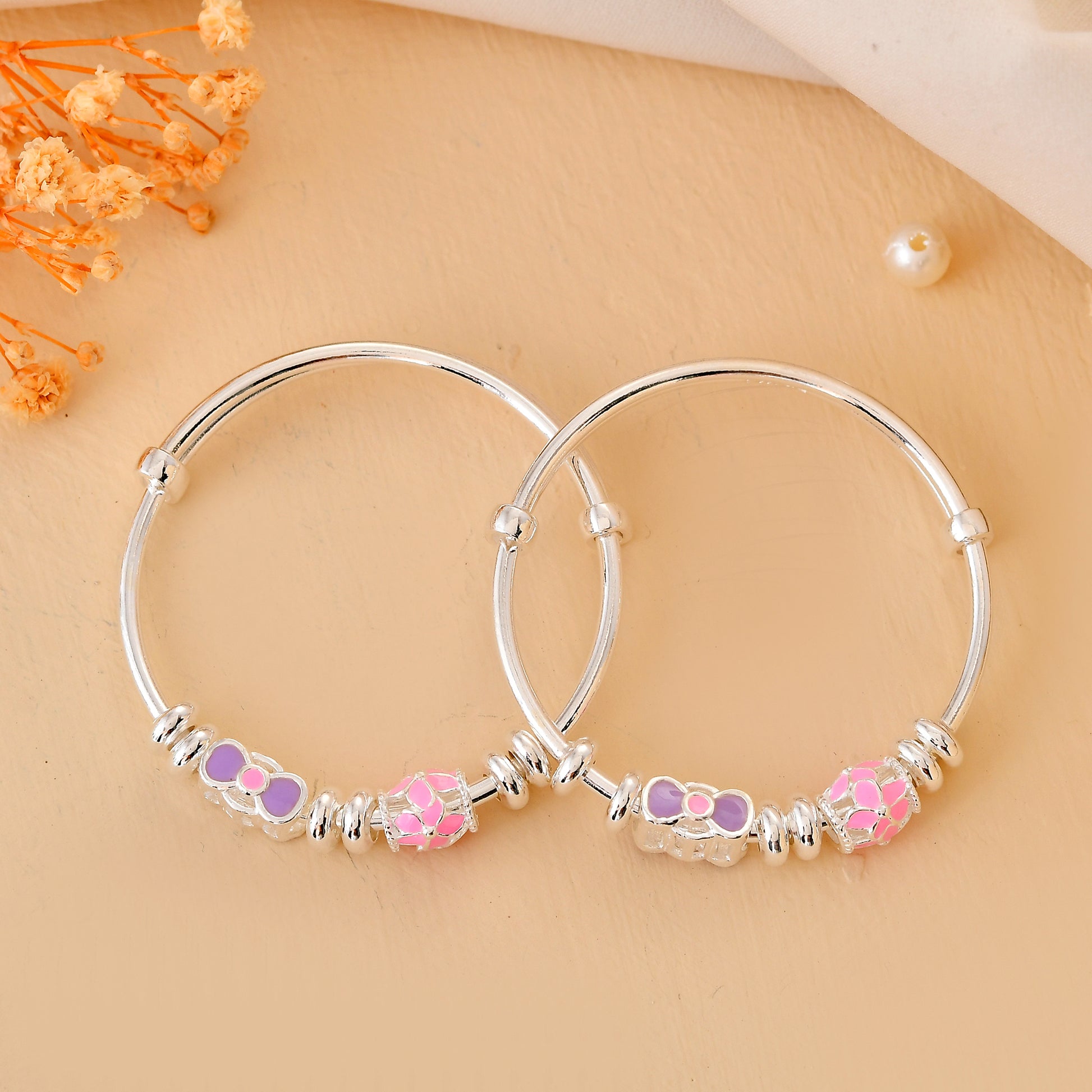 Pink-Bow Sterling-Silver Baby Bangle Set | Adjustable Kada with Mosaic Enamel Beads