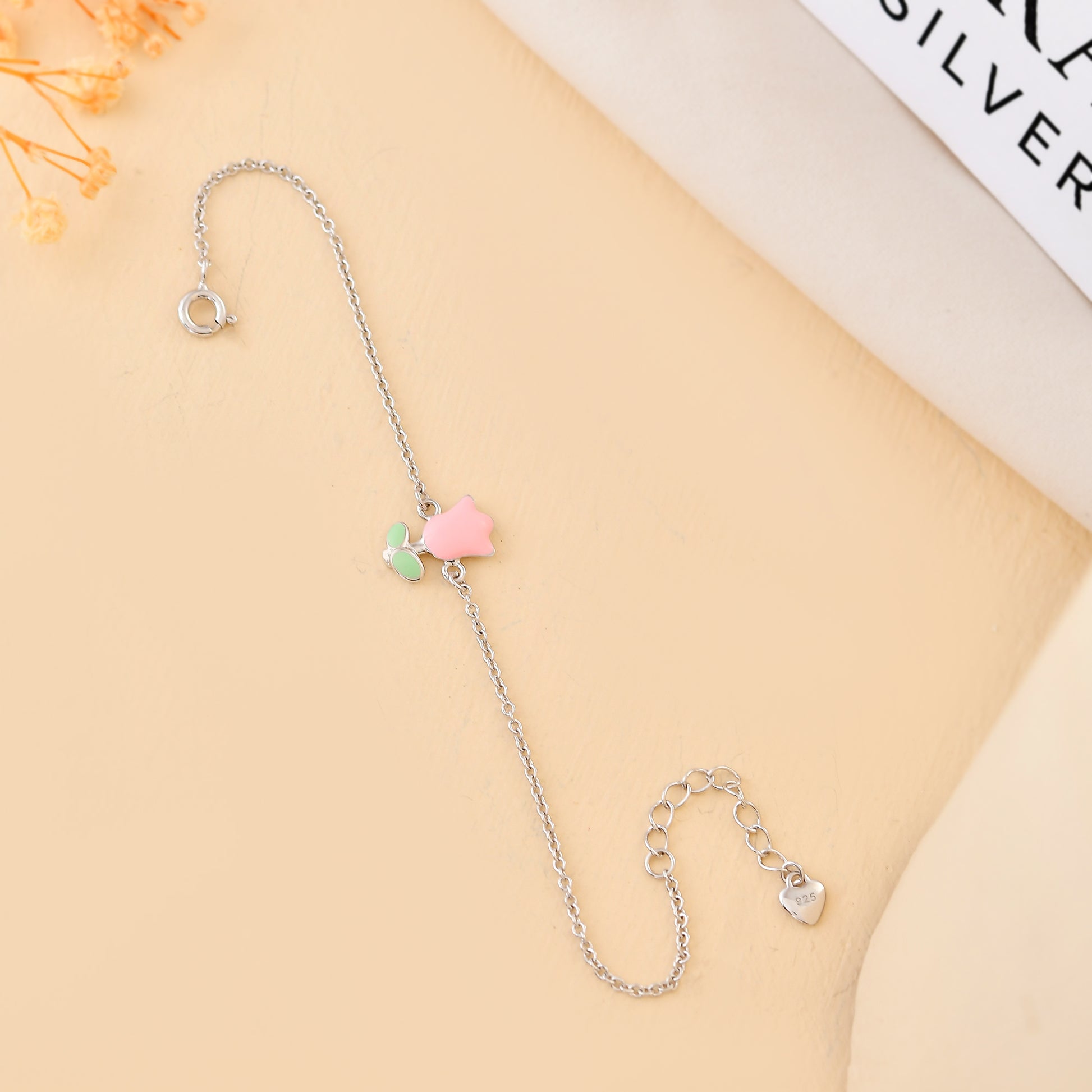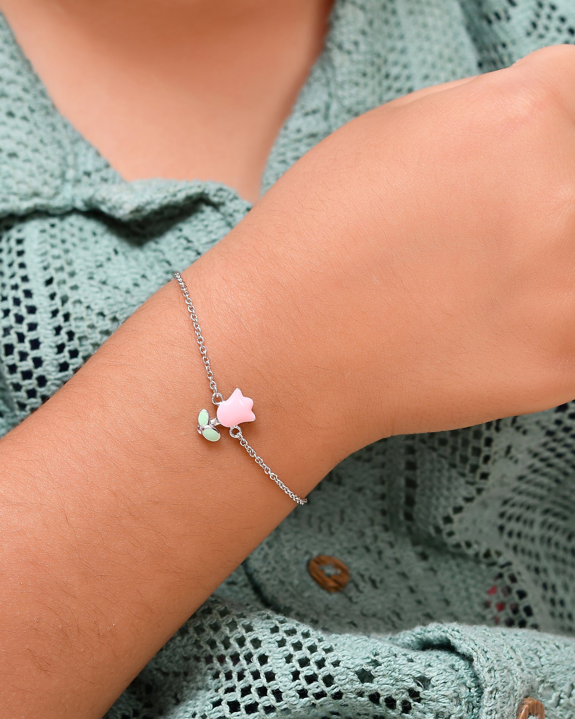 Pink-Tulip Sterling-Silver Kids Bracelet | Adjustable Chain & Mint-Leaf Charm