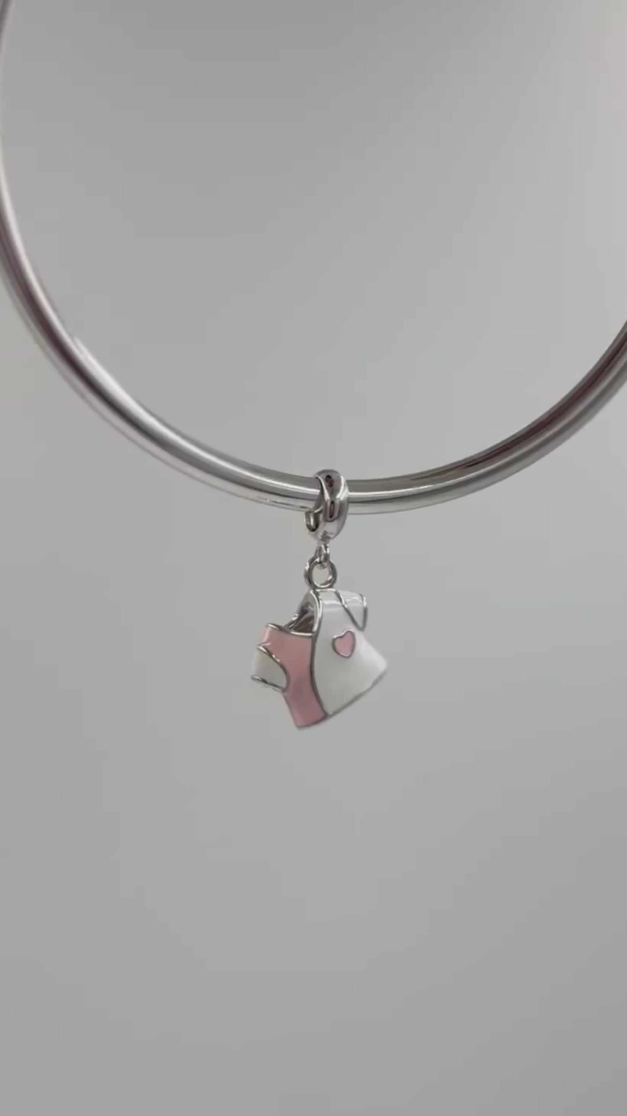 Celebrate the little joys with this charming Baby T-Shirt Pendant in 925 sterling silver. Featuring a two-tone design in soft pink and white enamel, this miniature tee comes with a delicate heart motif on the front, making it perfect for baby-themed bracelets, new mom gifts, or a personal keepsake.