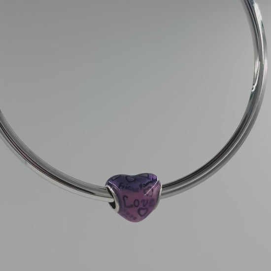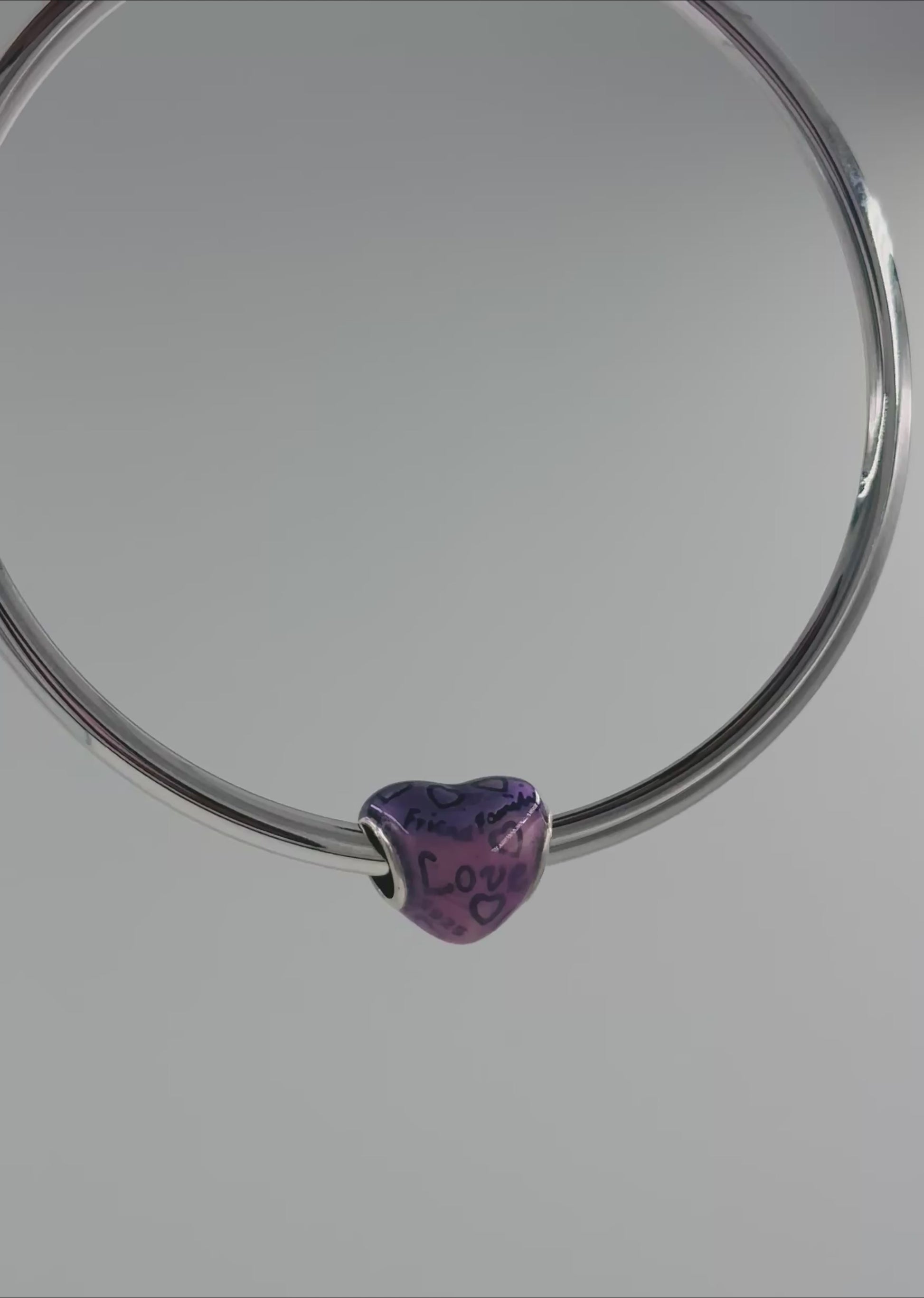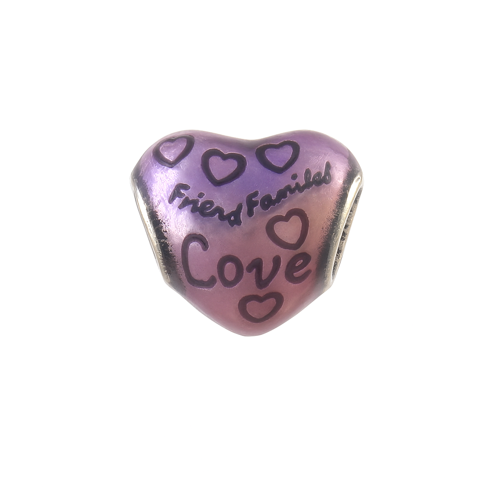 Made from 925 sterling silver, the heart-shaped bead is coated in a glowing ombre enamel — transitioning from violet to pink — and adorned with playful heart motifs and the words Friends, Family, and Love.