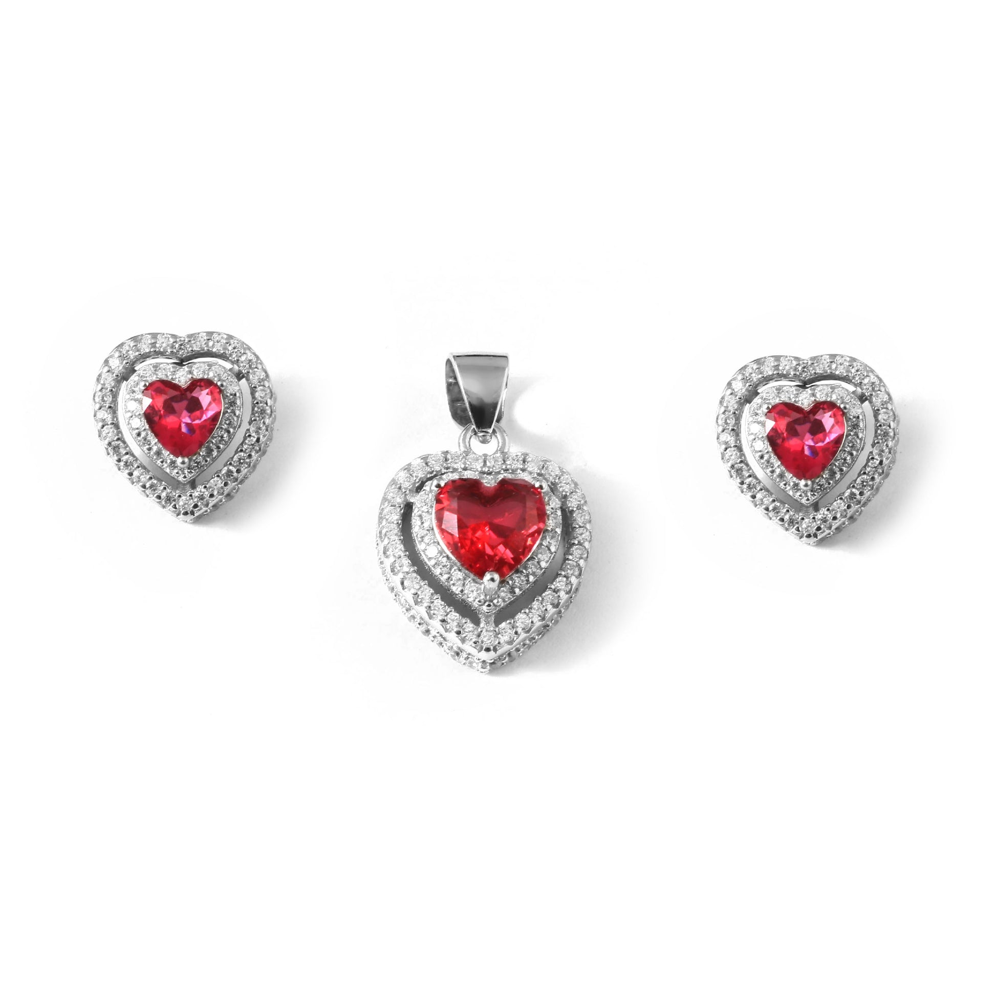 The centerpiece of this set is a fiery red, heart-shaped ruby zirconia surrounded by two delicate layers of sparkling pavé-set CZ stones.