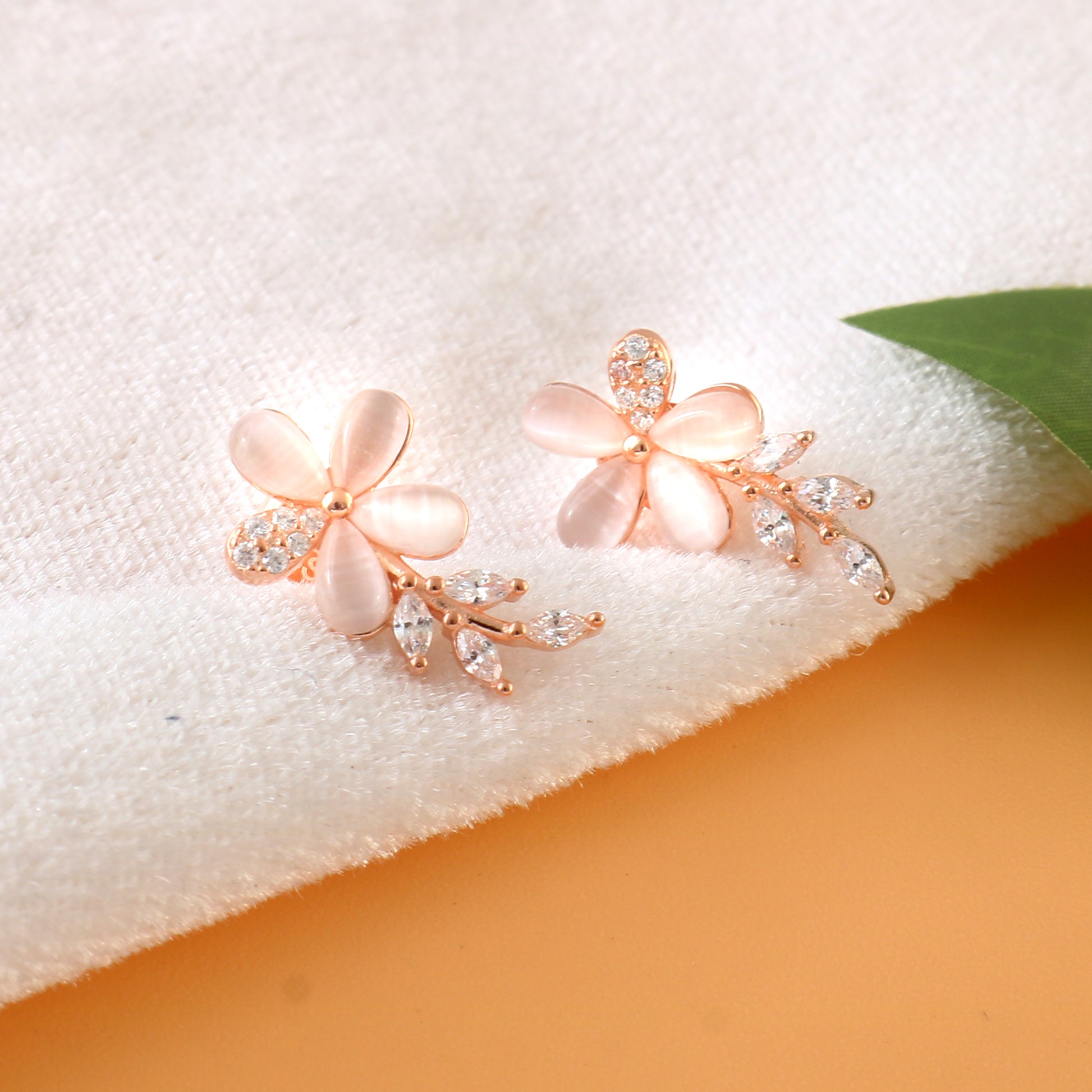 Rose Gold Floral Stud Earrings – Pink Petal Flower Earrings with CZ Leaf Detailing