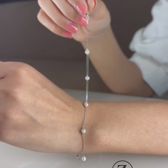 Five hand-selected 5 mm white shell pearls appear to “float” along a silky box chain, each secured by minimalist bar spacers that keep the gems evenly balanced around your wrist.