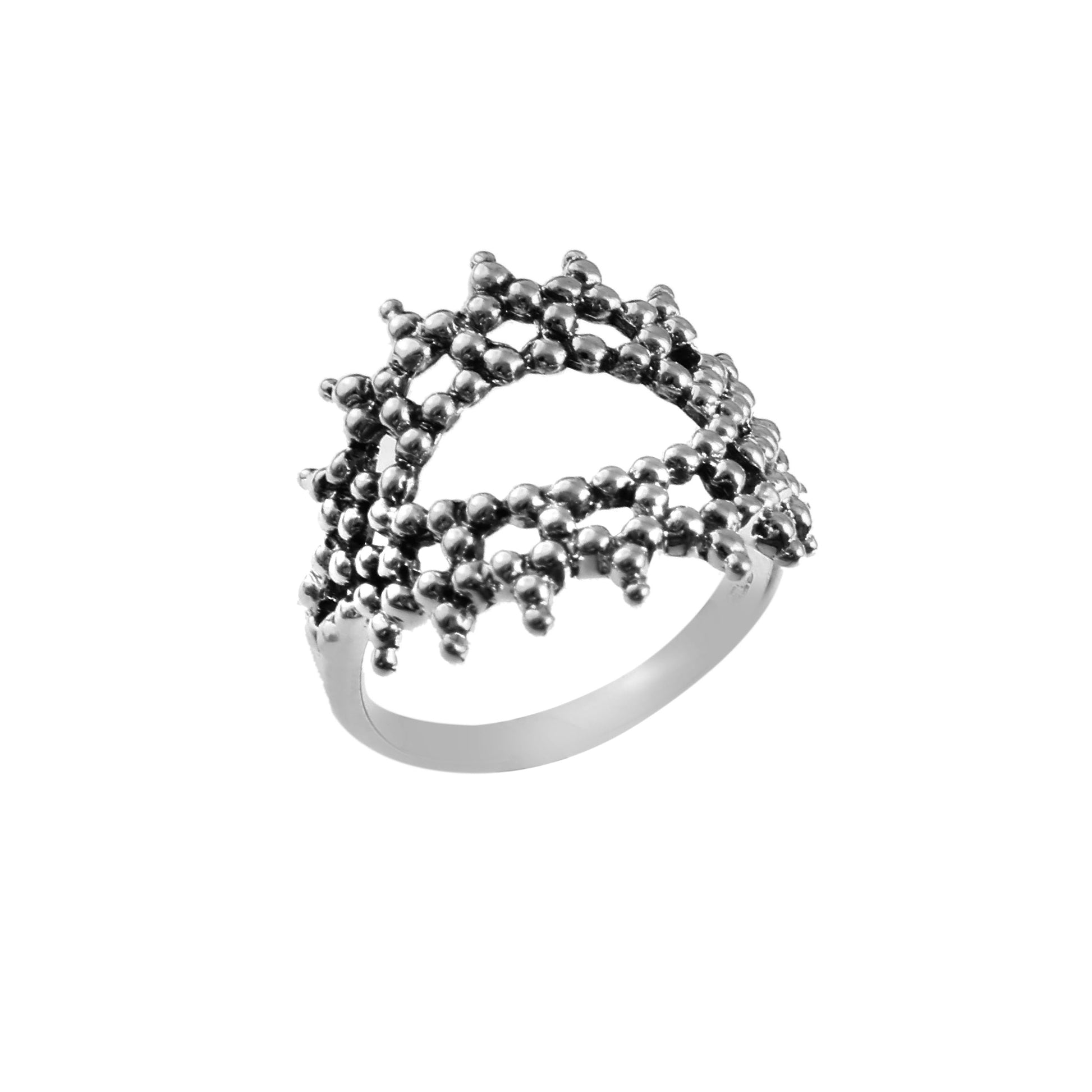 Command attention with this stunning Sterling Silver Crown Beaded Ring. Its intricately beaded pattern mimics the elegance of a regal crown, creating a unique texture and bold silhouette. Perfect for those who love maximalist or royal-inspired jewelry, this handcrafted piece adds a majestic edge to any outfit. Whether worn solo or as a dramatic stack topper, it’s a conversation starter with timeless appeal. Made from high-quality 925 sterling silver, this ring offers both durability and shine.