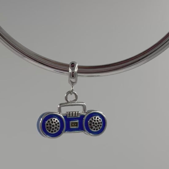 Sterling Silver Boombox Charm with Blue Enamel – 80s Retro Radio Pendant for Bracelets & Necklaces