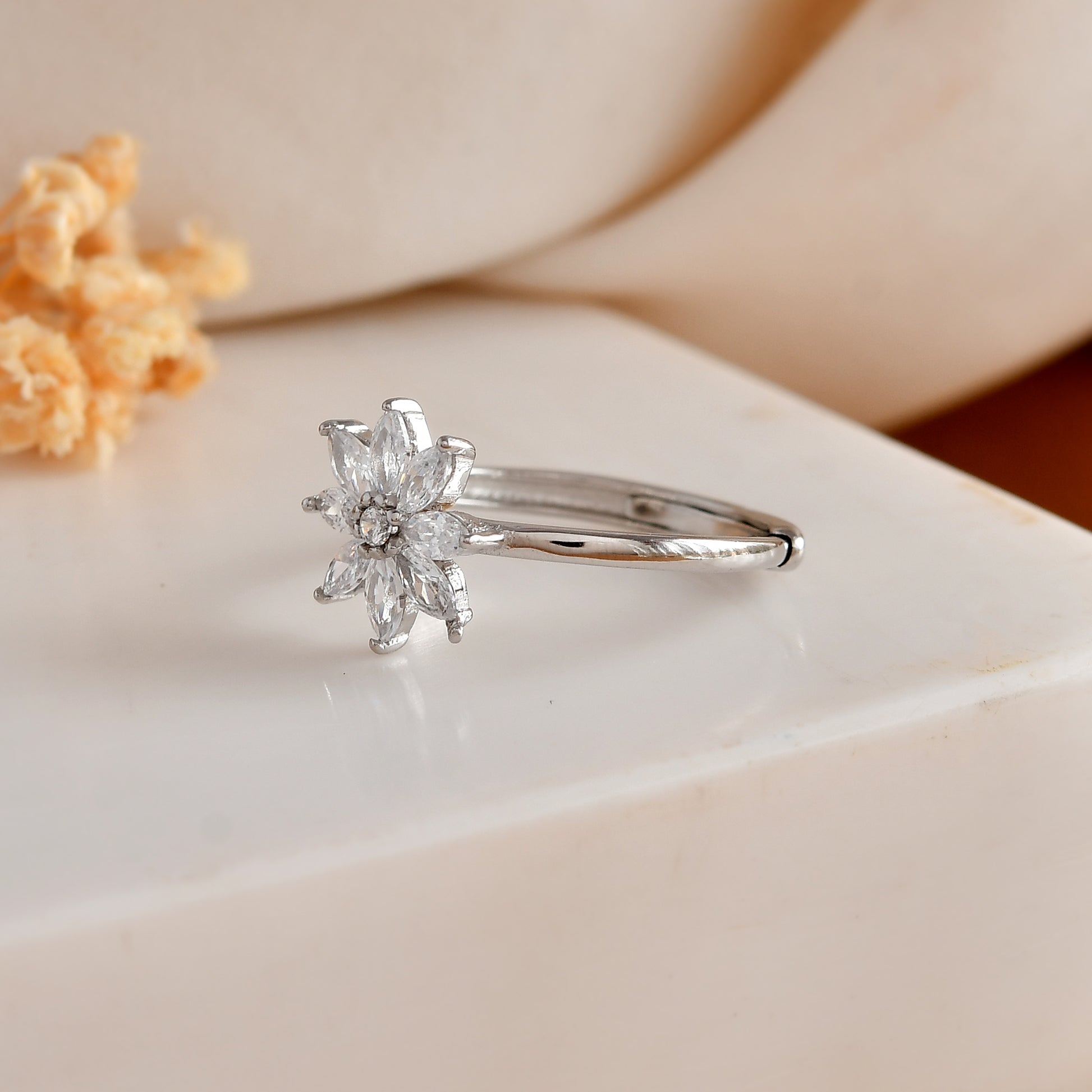 Eight marquise-cut AAA cubic-zirconia petals and a brilliant-round center stone are handset into a low-profile cluster that catches light from every angle while remaining snag-free for daily wear.