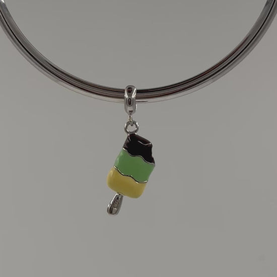 Shaped like playful popsicles, each charm is carefully enameled in vibrant, glossy colors – from yellow and mint green with chocolate drizzle to pastel pink, white, and orange.