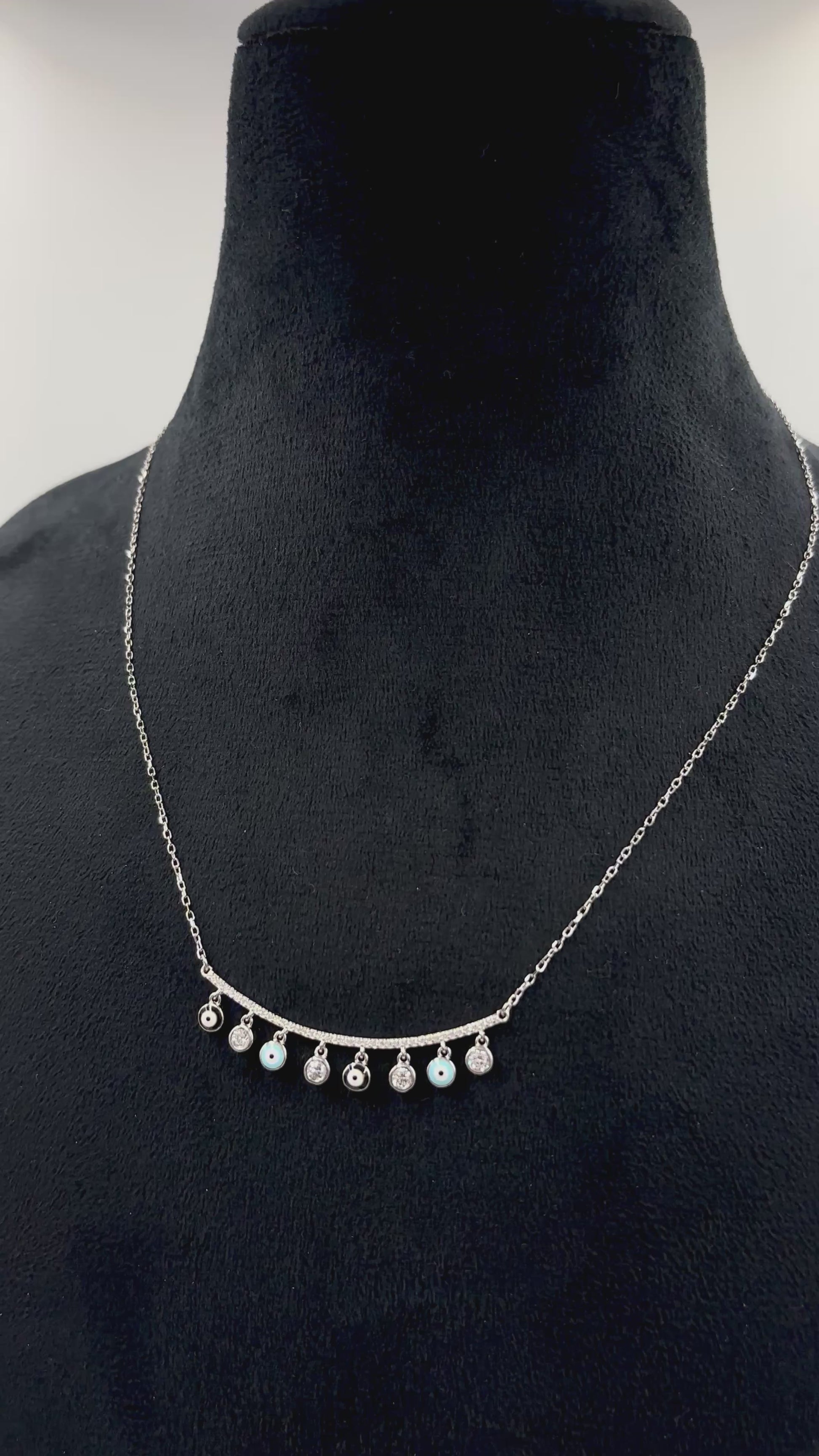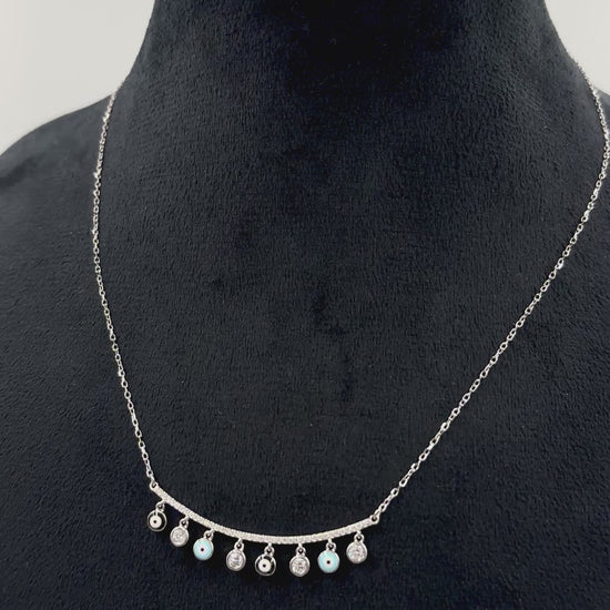 A slender bar, micro-pavé set with brilliant cubic-zirconia, curves gently to flatter the neckline while eight dainty dangles sway below—four shimmering clear CZ discs for sparkle and four enamel evil-eye charms in classic black and sky blue to ward off negative energy.