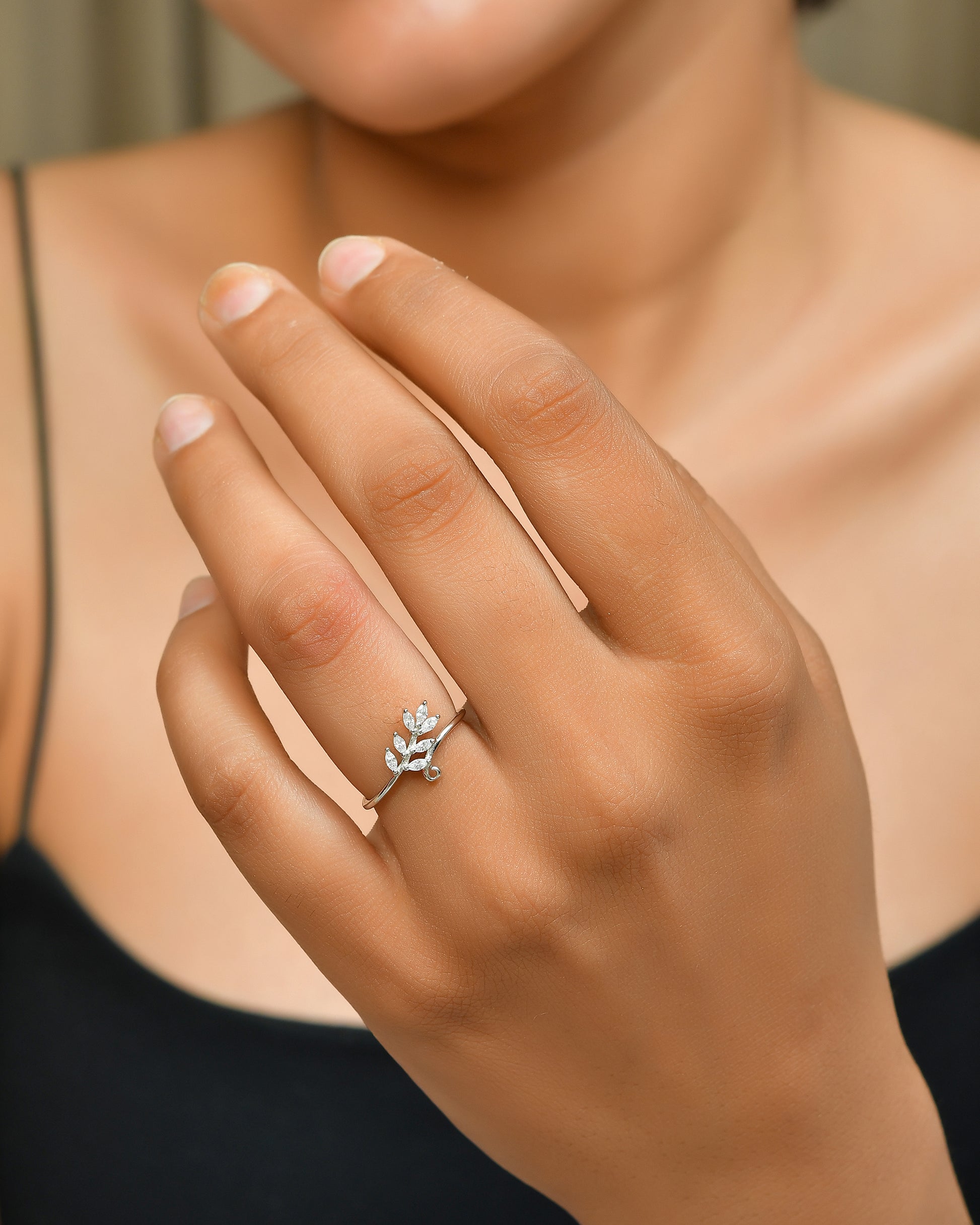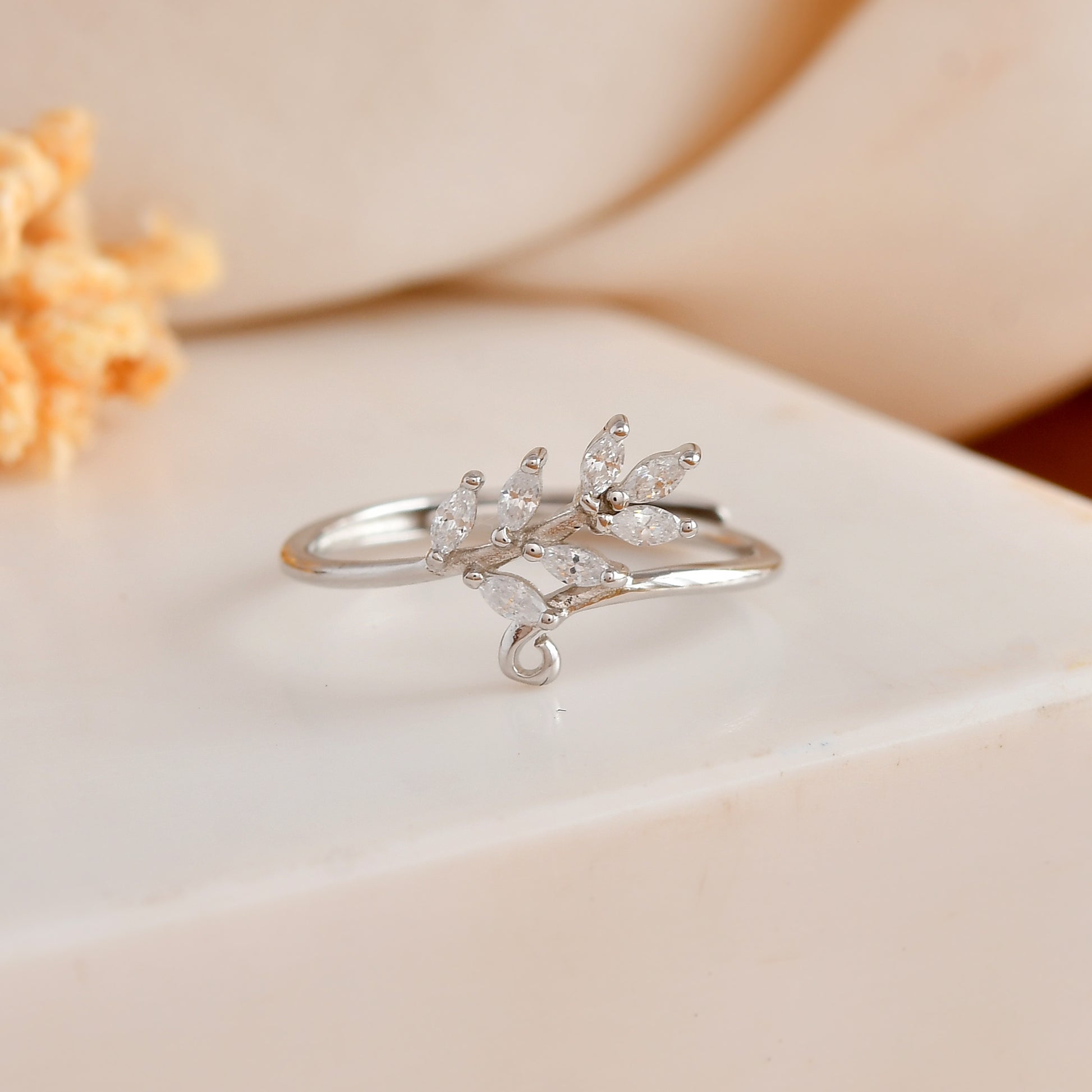 Sterling Silver Leaf Branch Ring with Marquise-Cut CZ – Adjustable Vine Wrap Band