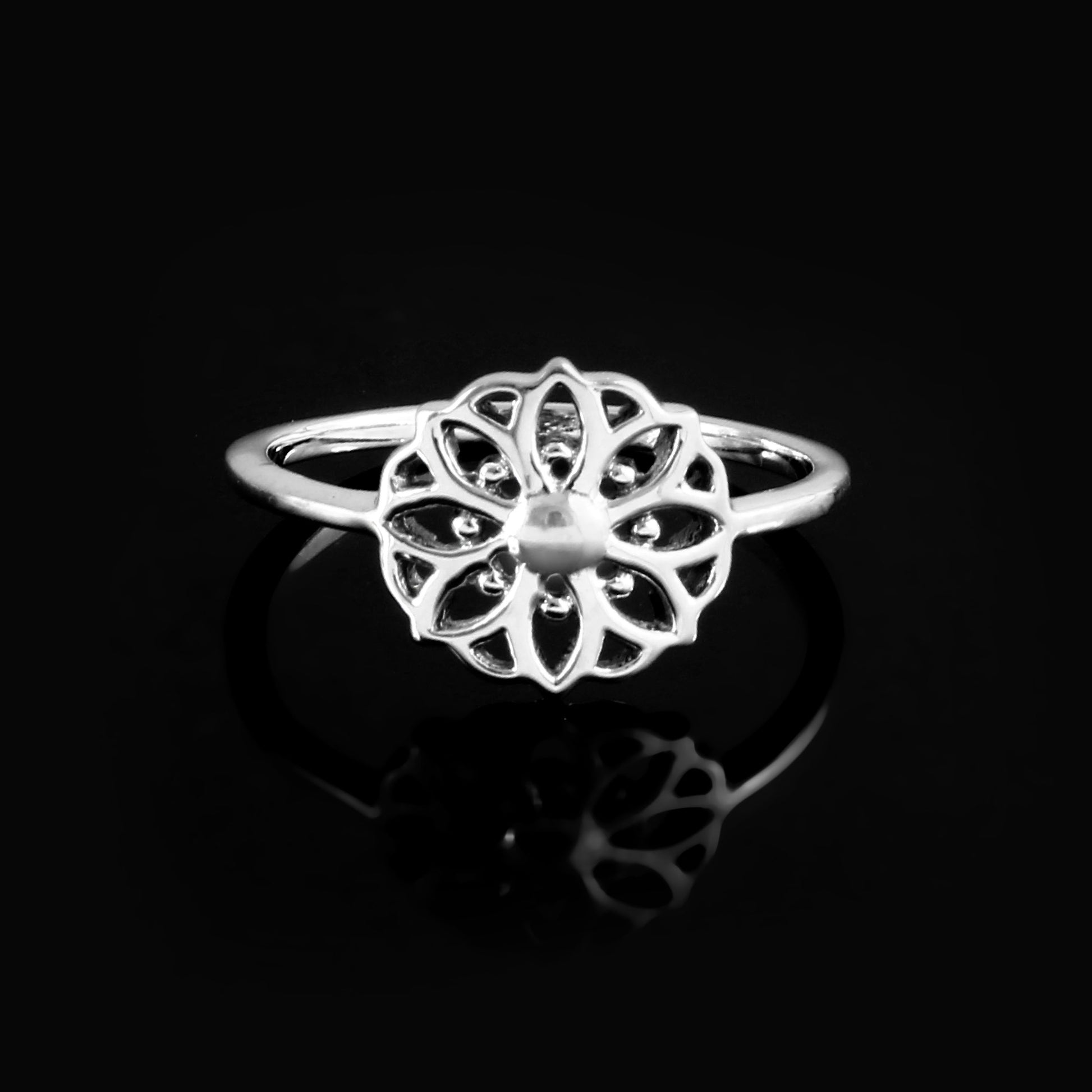 Channel serene energy and timeless design with this sterling silver mandala flower ring. Crafted with intricate petal motifs forming a balanced circular pattern, this lightweight yet statement-worthy piece celebrates harmony, beauty, and mindfulness. Whether worn solo or stacked with others, its spiritual charm and artisan detailing make it a favorite for daily wear or thoughtful gifting. Handcrafted in 925 sterling silver with a polished finish, it's the perfect accessory for those who embrace conscious, artistic style.