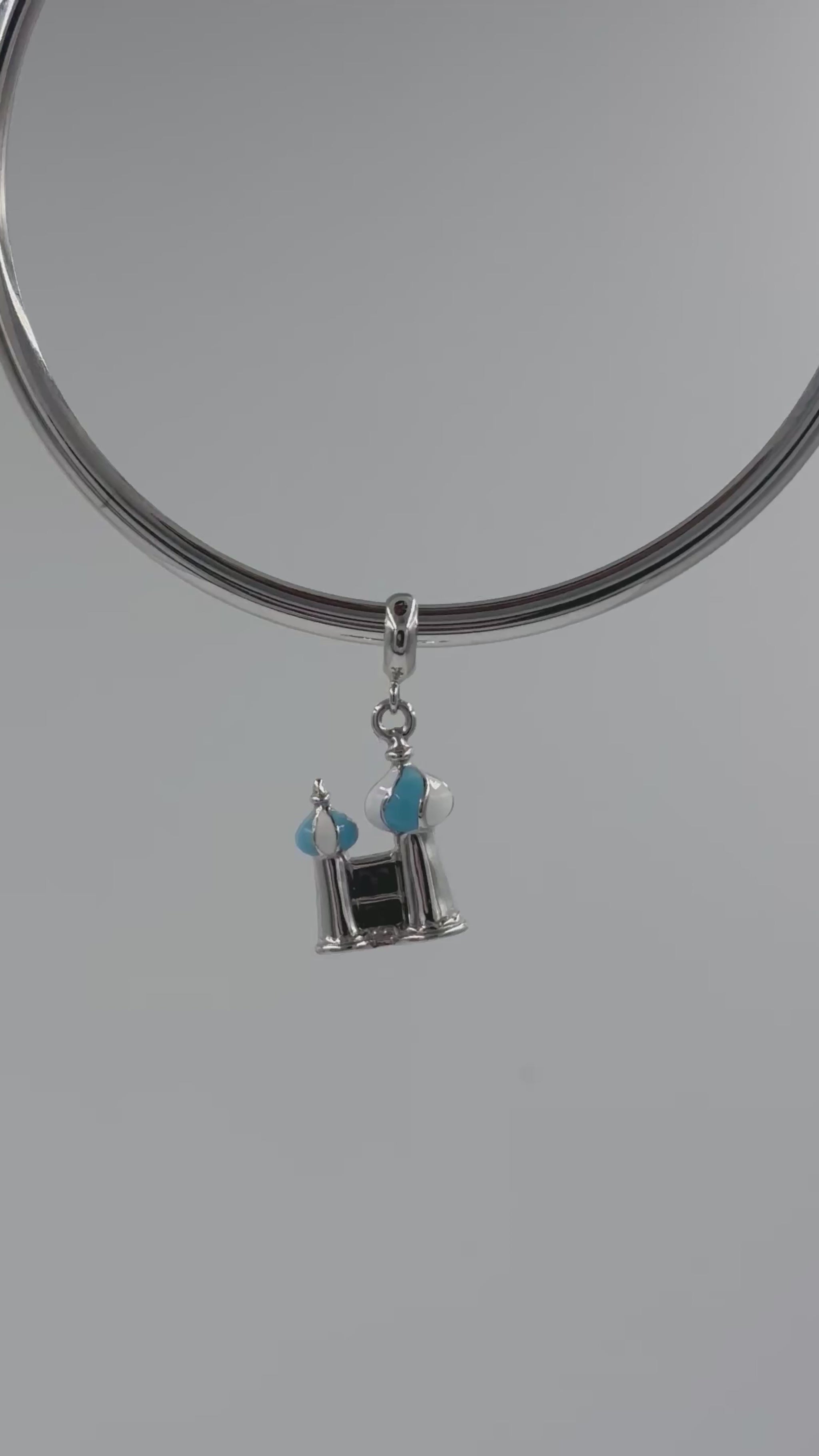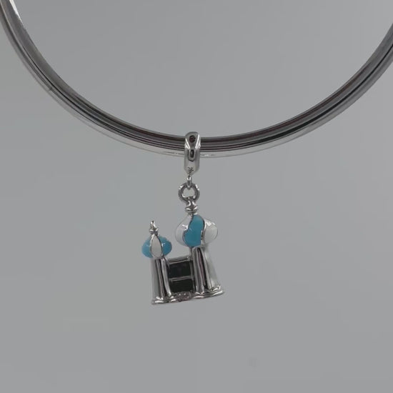 This detailed charm features iconic twin domes with alternating blue and white enamel panels, symbolizing elegance and spirituality.