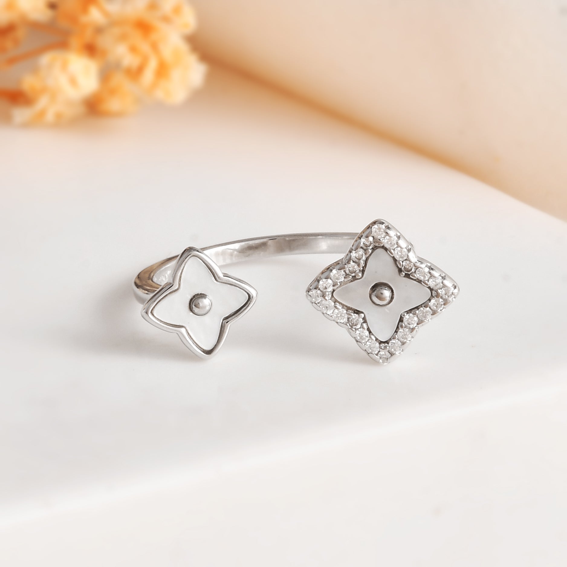 Sterling Silver Quatrefoil Open Ring with White Enamel & Pavé CZ – Adjustable Clover Flower Band