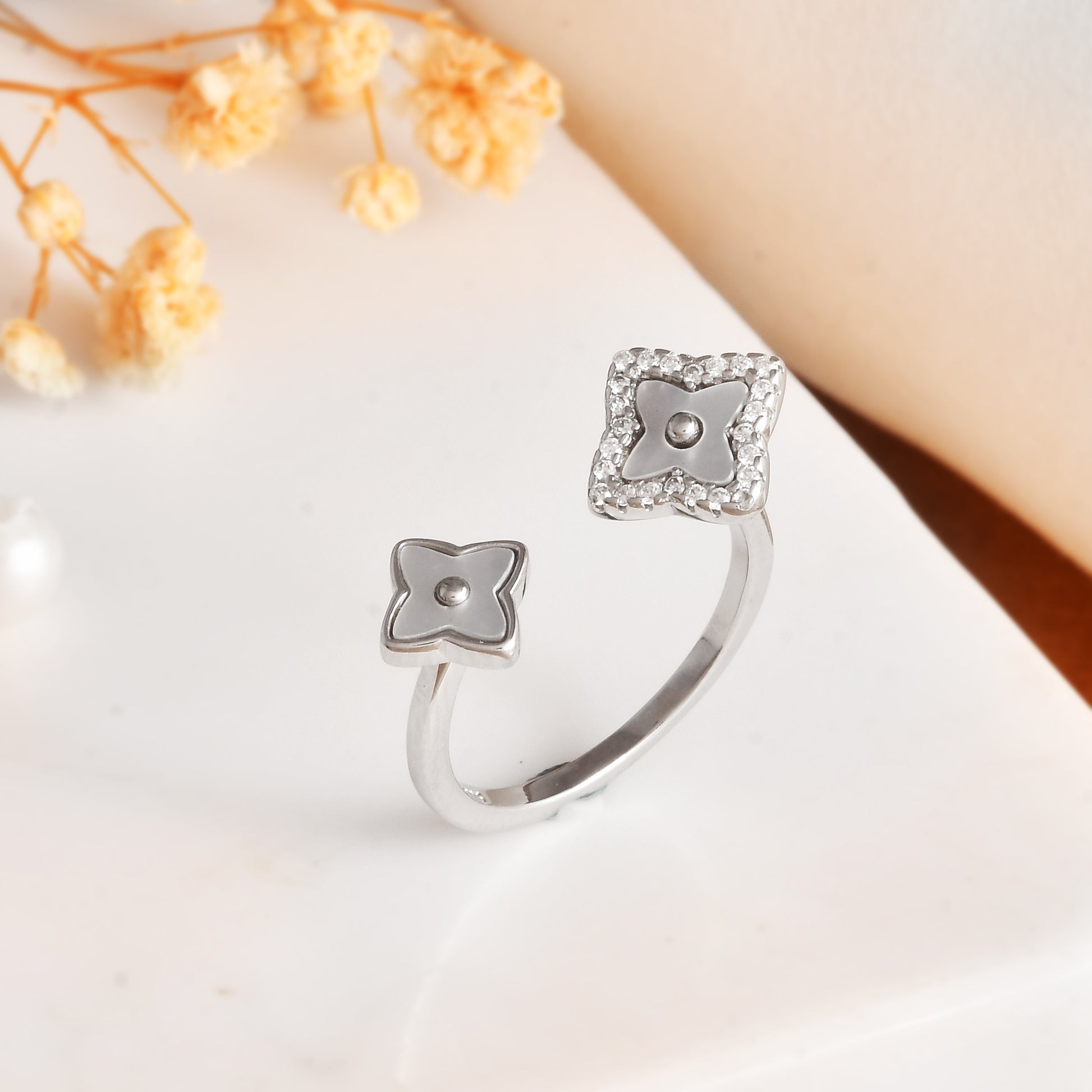 Crafted from solid 925 sterling silver and rhodium-plated for lasting brilliance, the open design features two offset quatrefoils that wrap the finger in modern symmetry.