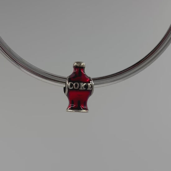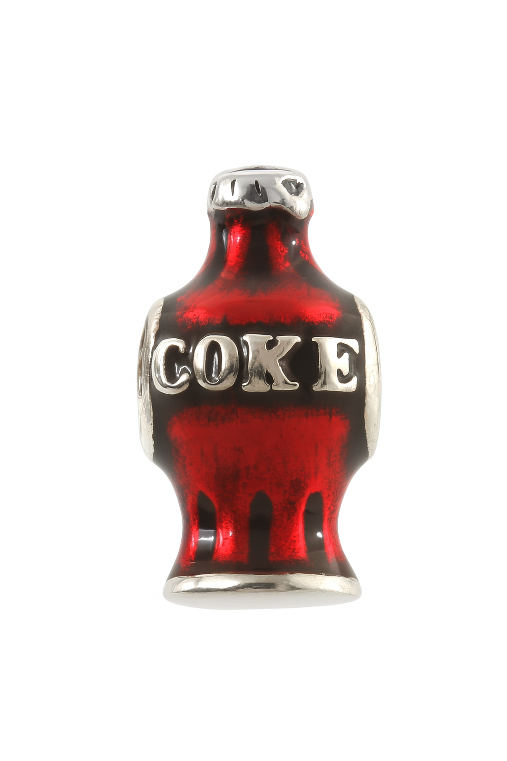 Crafted from high-quality 925 silver and coated in vibrant red enamel, this charm captures the classic soda bottle shape with detailed silver lettering.