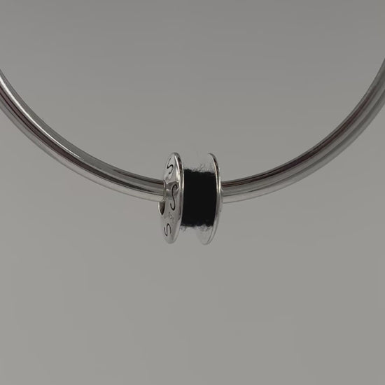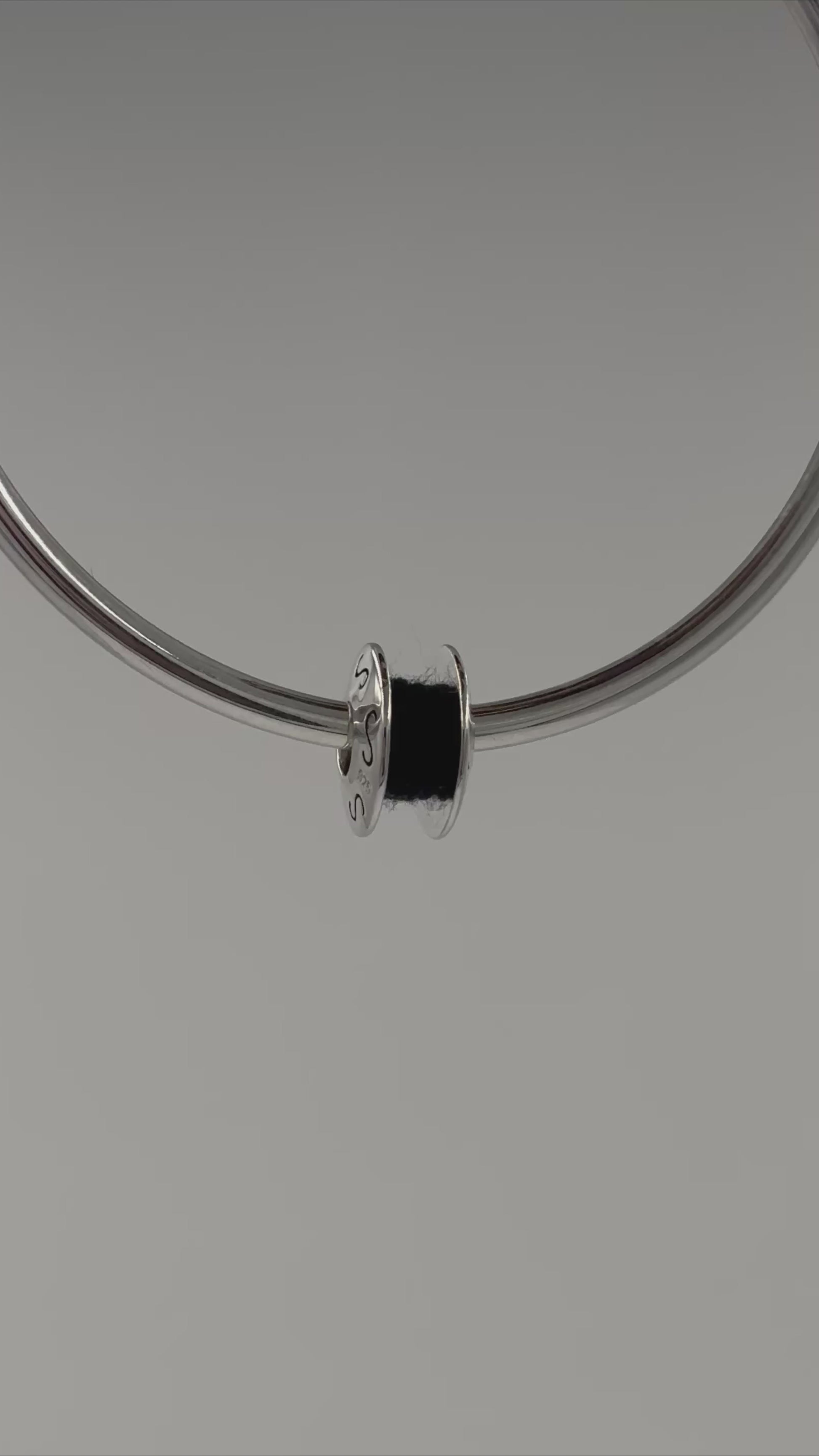 Make a sleek statement with this unique silver thread charm, crafted from 925 sterling silver with a rich black thread core and engraved "S" pattern around the body. The donut-shaped face adds a bold yet clean look from every angle.