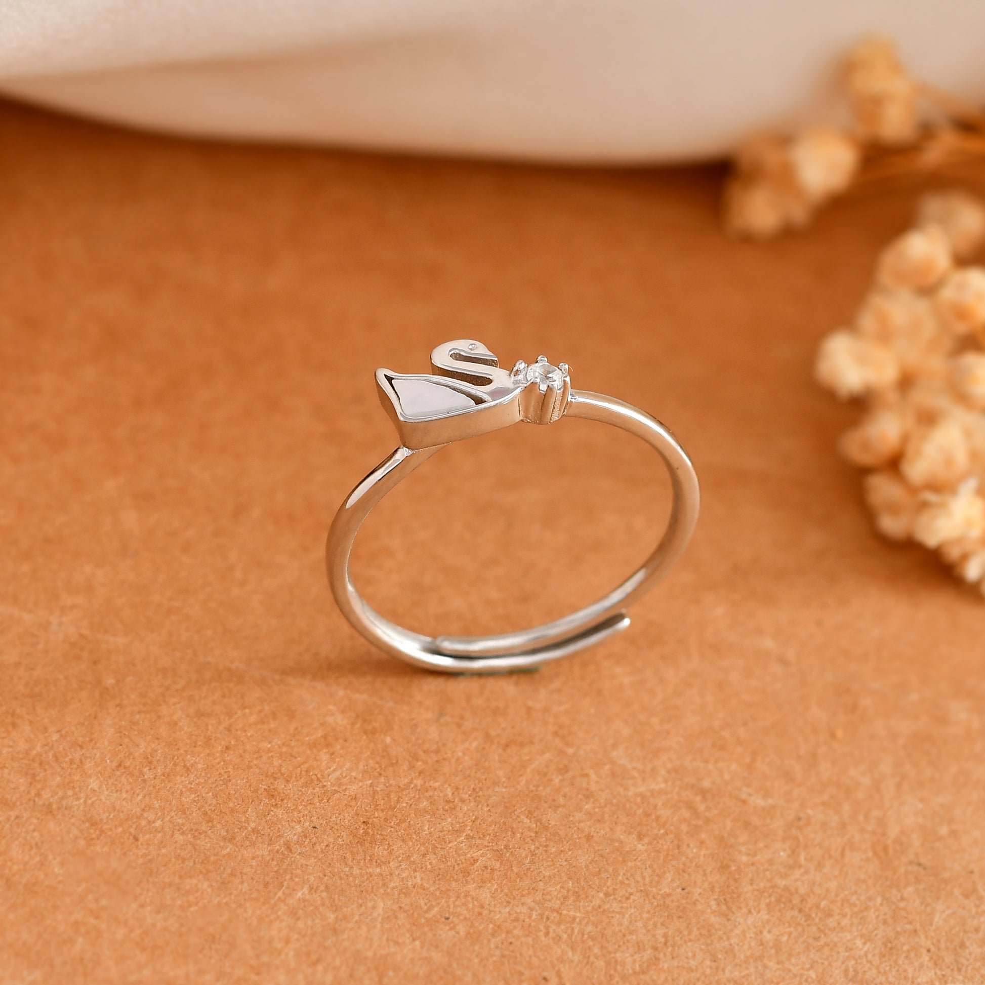 Sterling Silver Swan Ring with White Enamel Wing & CZ Accent – Adjustable Dainty Bird Band