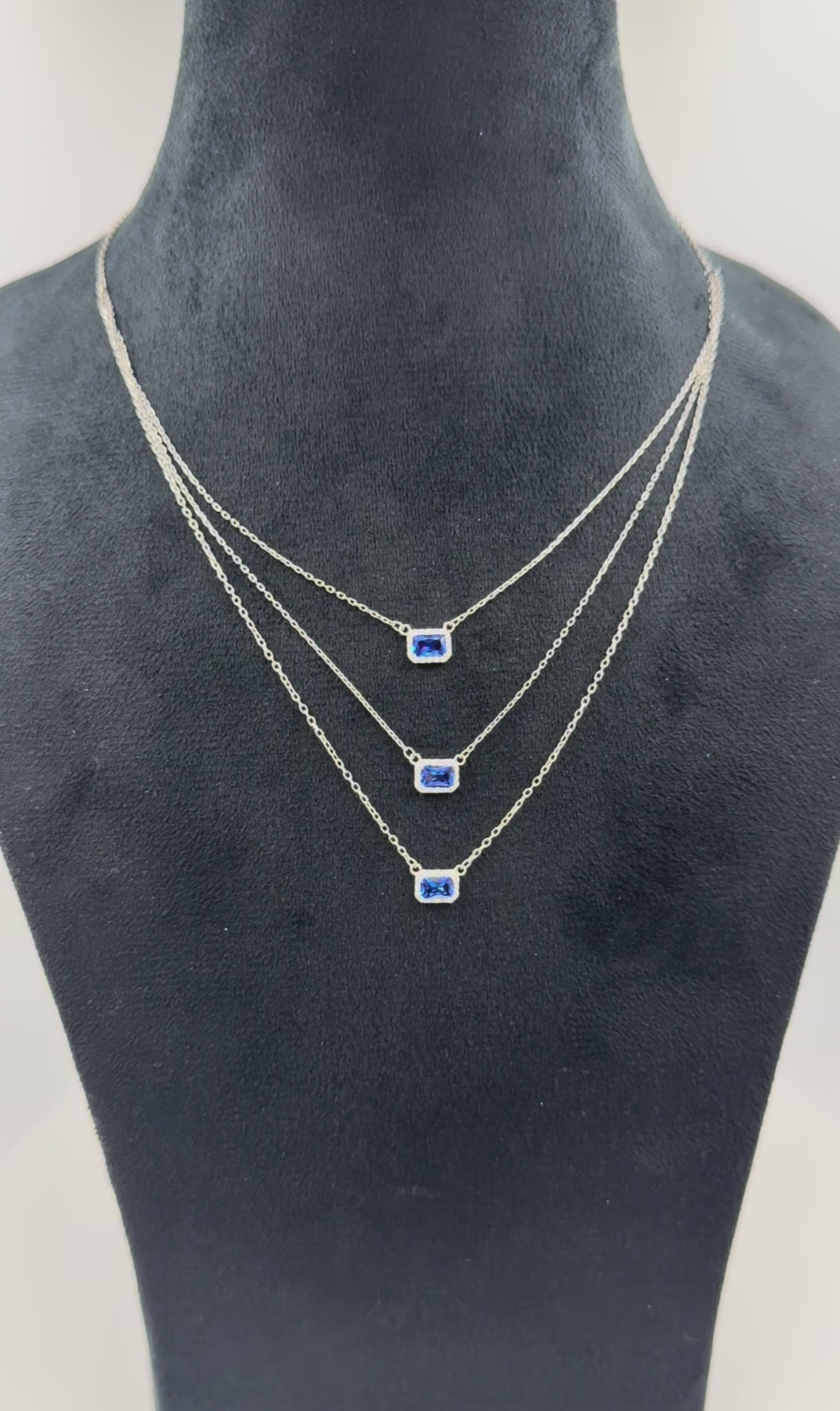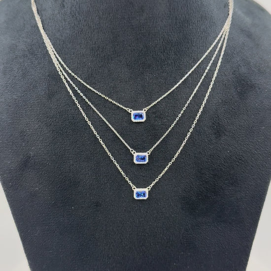 This necklace unites three delicate sterling-silver chains, each set with an emerald-cut cubic-zirconia center stone framed by a micro-pavé halo.