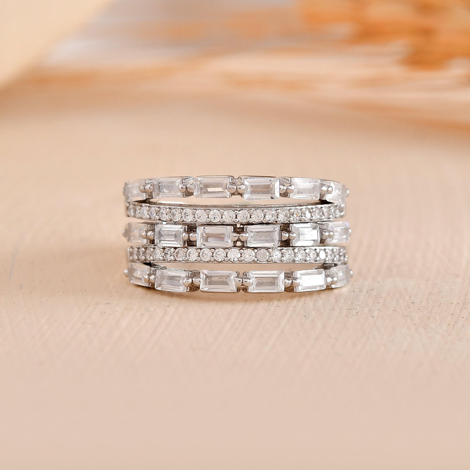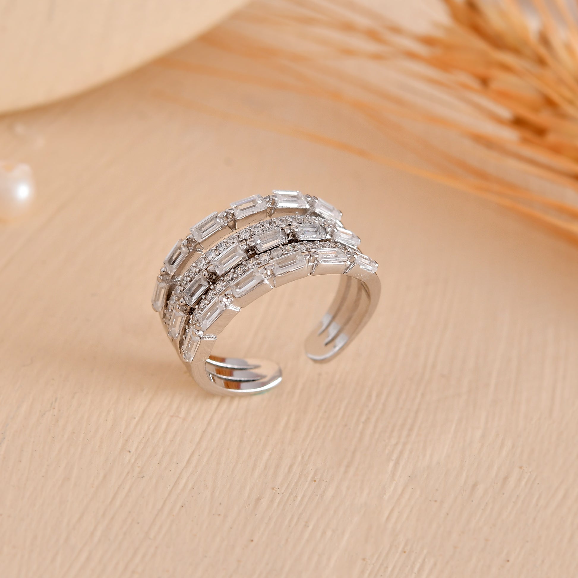 Sterling Silver Triple-Row Baguette CZ Statement Ring – Adjustable Cocktail Band