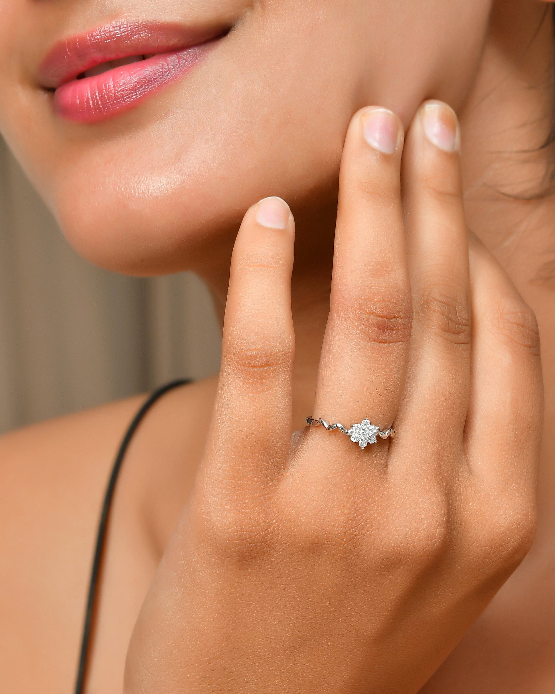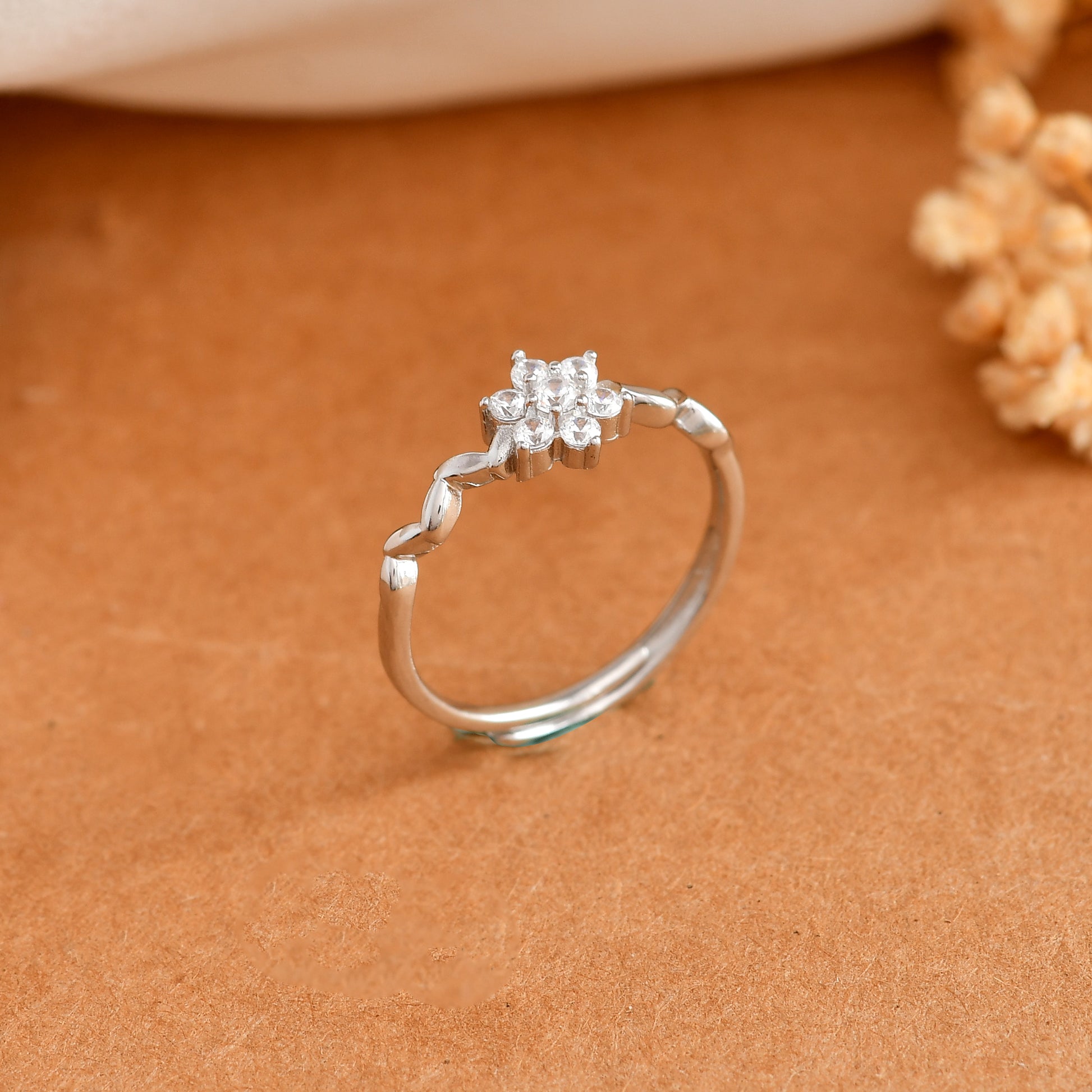 The slim band is sculpted into a soft twist that echoes leafy stems, leading to a hand-set cluster of brilliant-cut cubic-zirconia stones arranged like a tiny six-petal flower.