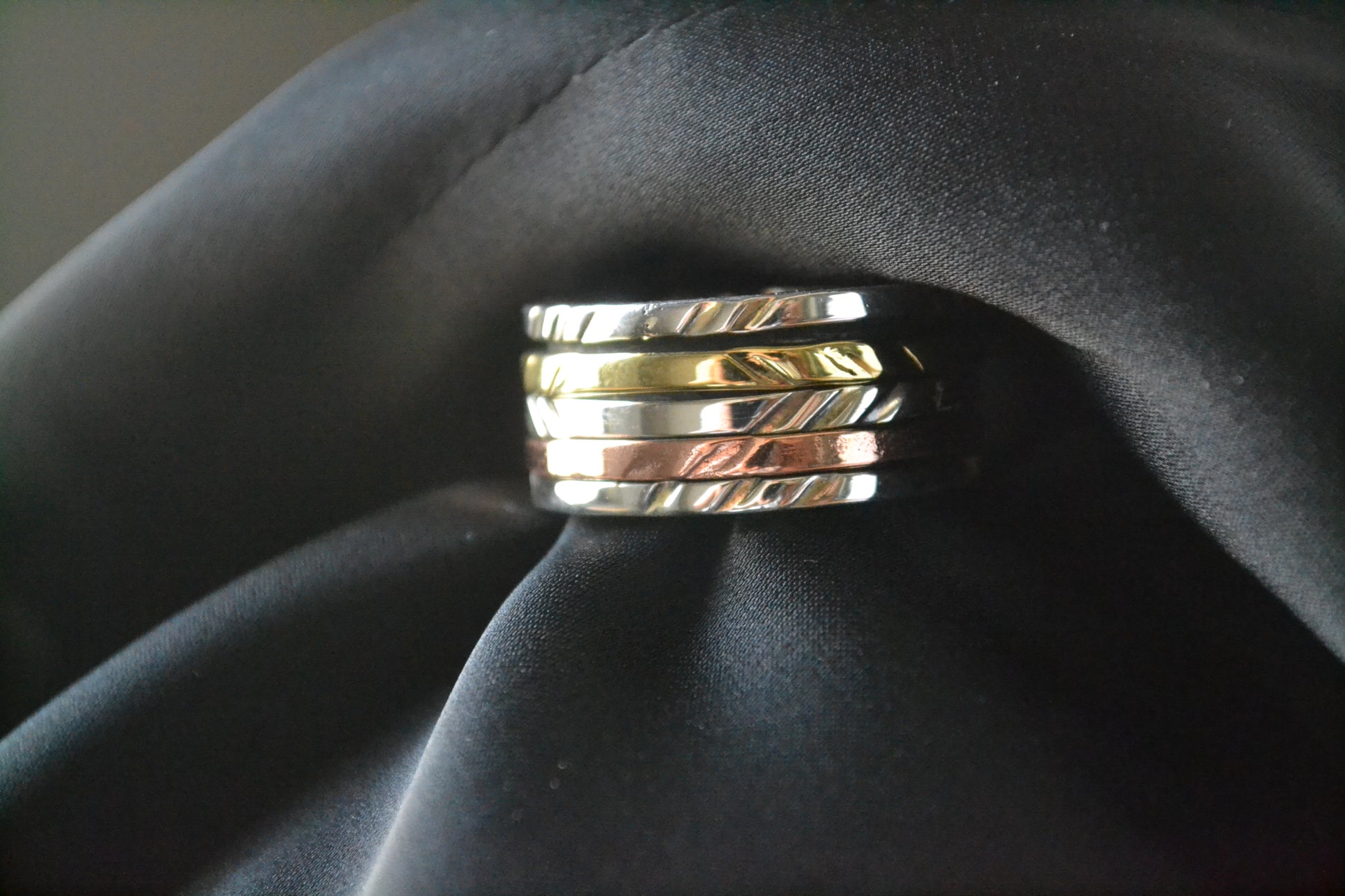This stunning tri-tone spinner ring is a handcrafted piece designed for both style and serenity. Featuring a solid 925 sterling silver base, the ring is adorned with individually rotating bands of brass and copper colored bands—offering a beautiful blend of metallic warmth. It has a substantial feel and is ideal for those who enjoy tactile jewelry that invites focus and calm.
